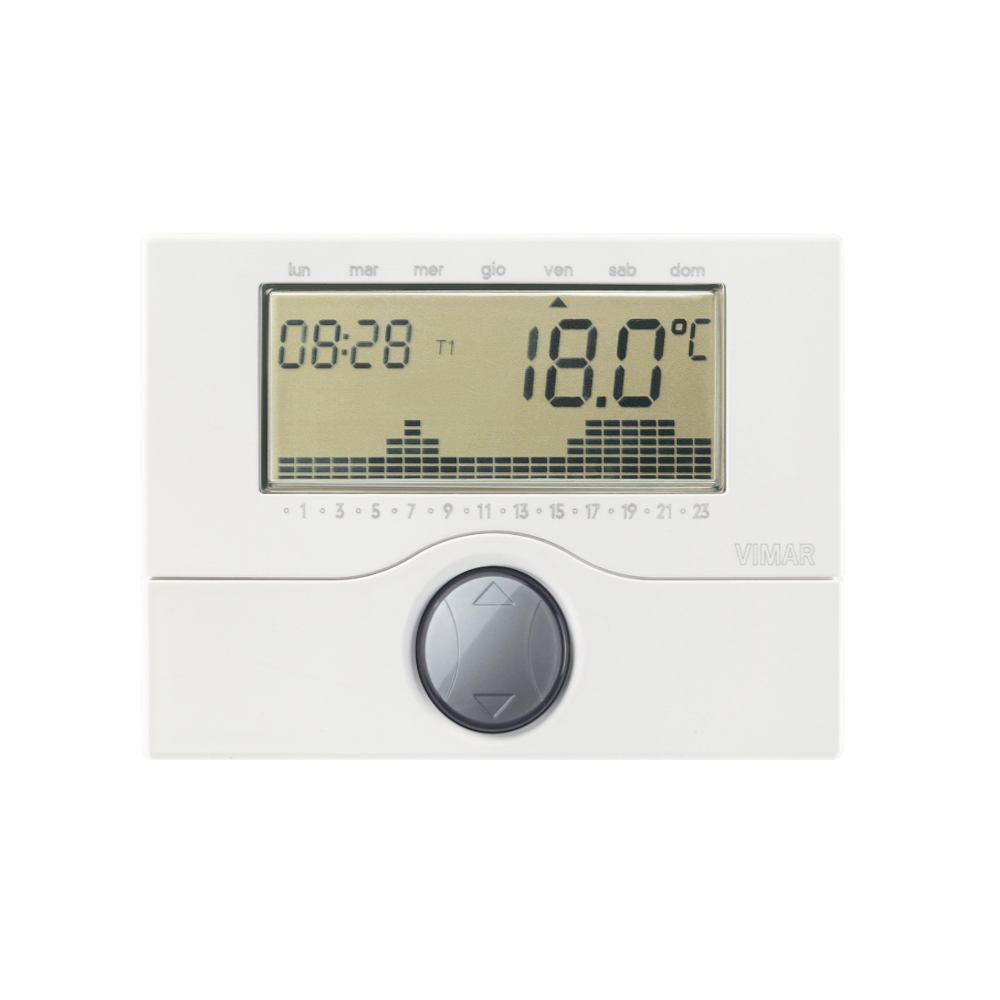 Cronotermostato a batterie Vimar, utilizzato per il controllo On/Off della temperatura dell’ambiente, possibile programmarlo sia in riscaldamento sia in condizionamento, inoltre risulta semplice da programmare.