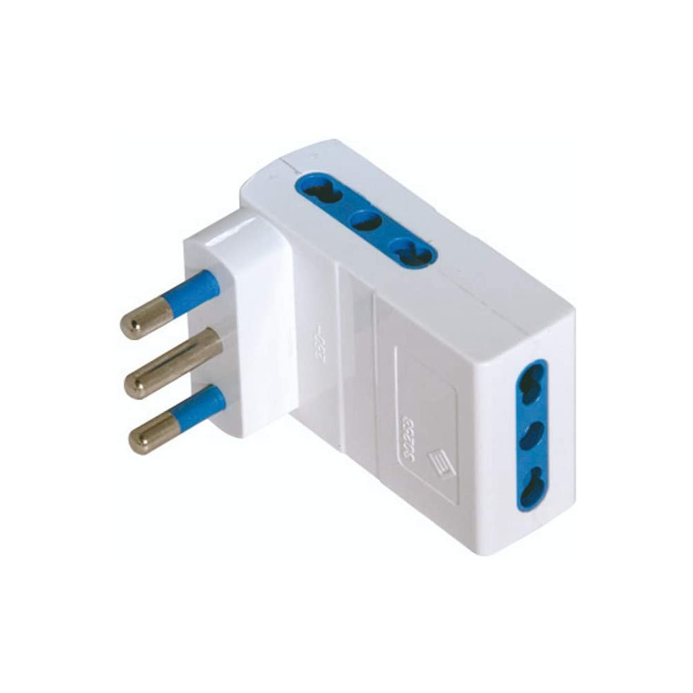 Adattatore triplo salvaspazio 2P+T 16A 3x16A. Utilizzato per inserire contemporaneamente tre prese in spazi ristretti.