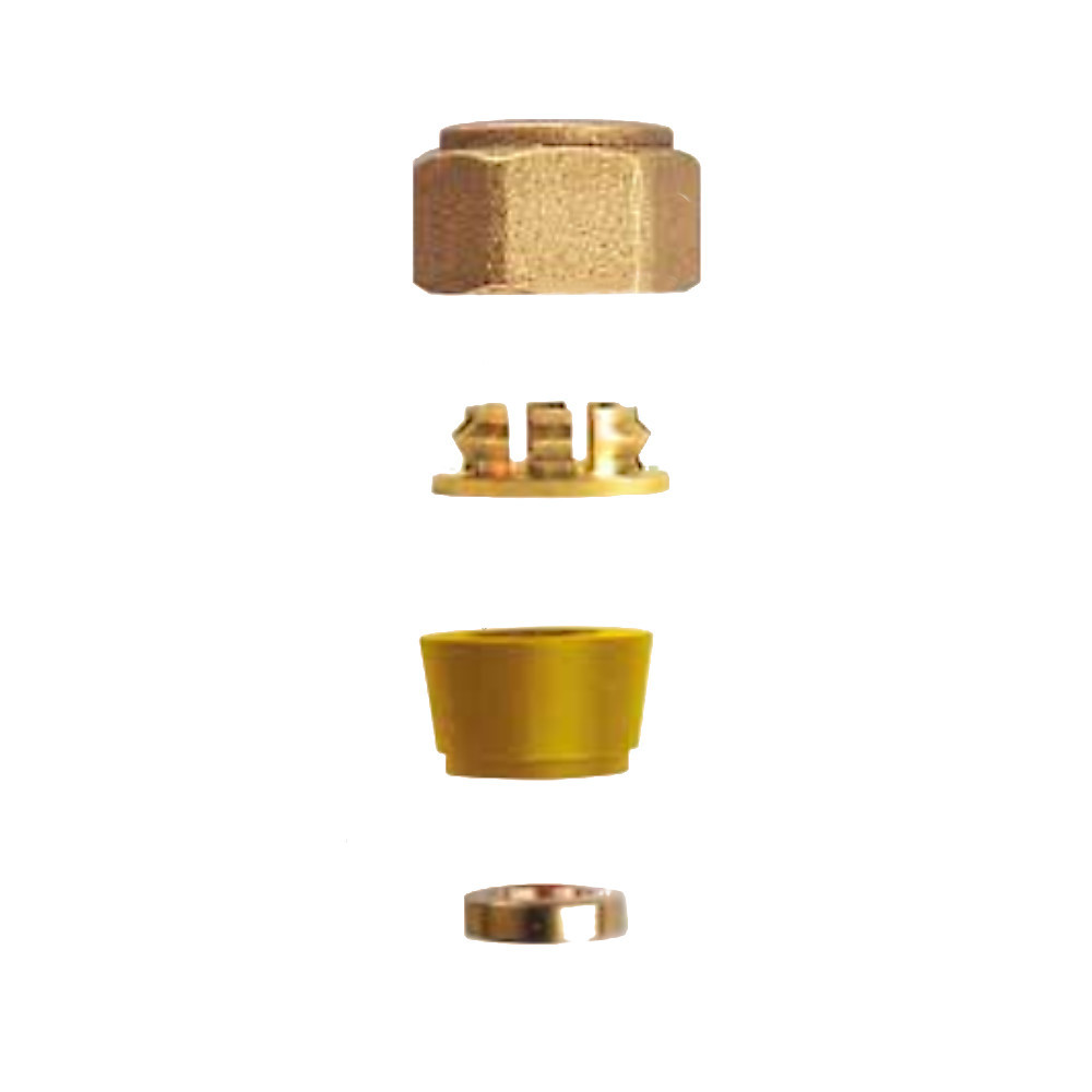 Il kit Arteclima è composto da una calotta in ottone stampato, una guarnizione conica in gomma gialla, una rondella guida tubo in ottone ed una riduzione stringitubo.