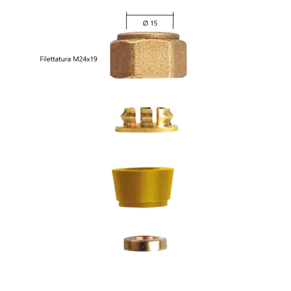 Il kit Arteclima è composto da una calotta in ottone stampato, una guarnizione conica in gomma gialla, una rondella guida tubo in ottone ed una riduzione stringitubo.