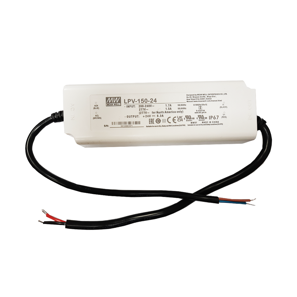 L’ Alimentatore della Mean Well da 150W 24V, è la scelta per giusta per un’installazione professionale in luoghi dove ci possa essere dell’acqua o particolarmente umidi, come installazioni all’esterno, illuminazione di insegne, piscine, illuminazione per giardini etc. Ha grado di protezione IP67 quindi è totalmente impermeabile. Gli alimentatori MEANWELL sono realizzati con i migliori componenti, per garantire durata e affidabilità nel tempo. Questo alimentatore può alimentare in sicurezza fino a 2 bobine di striscia LED 24Vdc. Ha una corrente in uscita di 6.3A con una potenza di 150 W e una tensione in uscita a 24V in Corrente Continua.