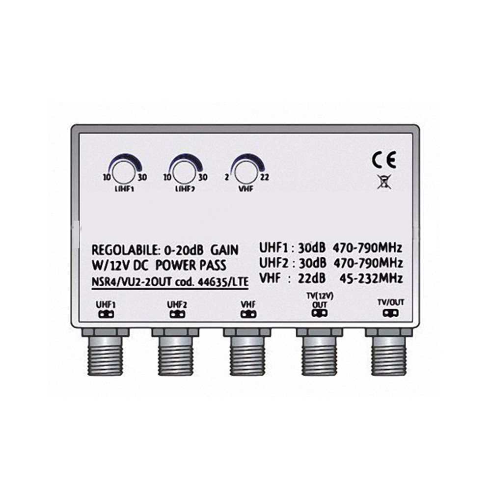 Amplificatore da palo tv con due uscite tv UHF regolabile da 10-30 db e una VHF regolabile da 2-22 db. L’amplificatore è libero da interferenze Lte.