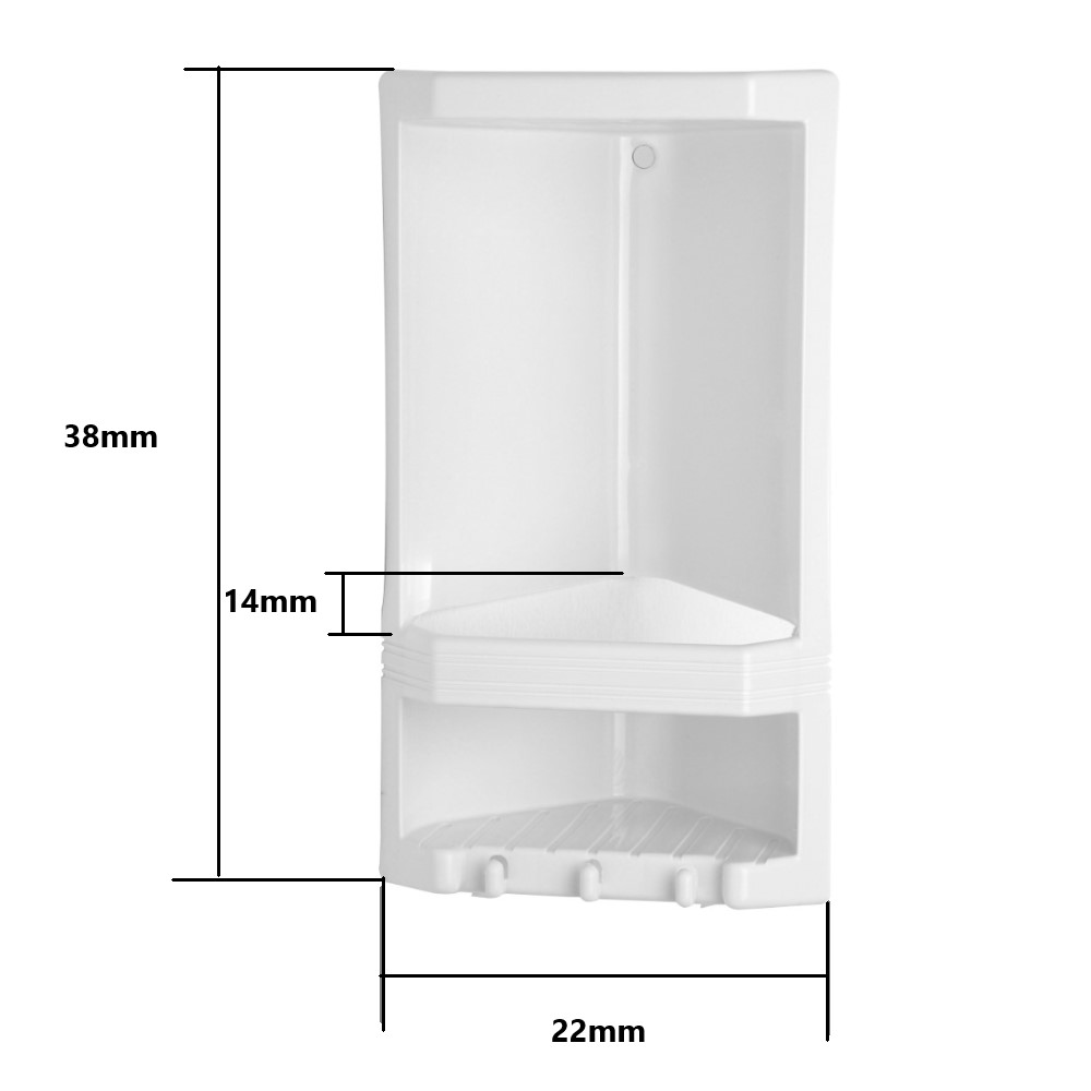 L’angoliera portasapone e oggetti è realizzata in resine termoplastiche con le misure di 22cm x 14cm x 38cm, di colore bianco. Pratico e funzionale, usato come porta oggetti all’interno di una doccia per riporre schampoo bagnoschiuma ecc. offrendo anche un ottima soluzione di design. E’ predisposto per essere applicata su di un muro angolare, tramite delle viti di fissaggio comprese di tasselli già in dotazione, le quali saranno nascoste da appositi otturatori.
