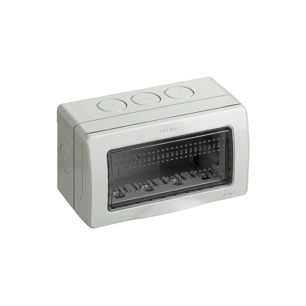 Contenitore 4 posti scatola stagna IP55. Adatto per l’installazione esterna di interruttori e prese della serie Bticino Matix. Protegge da polvere e getti d’acqua.