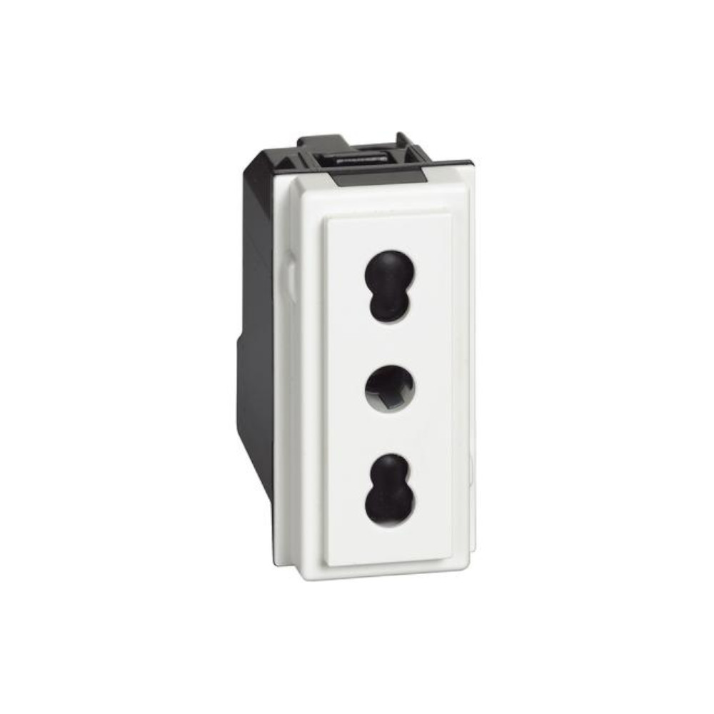 Bipresa 2P+T 10/16A 250V bianca di Bticino Living Now. La presa ha la possibilità di inserire sia spine piccole da 10A e sia spine grandi da 16A. Alveoli protetti.