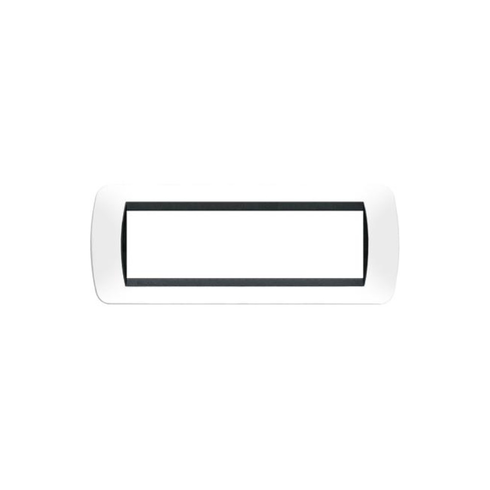 Placca 7 posti in tecnopolimero bianca con cornice interna nera di Bticino Livinglight. La placca o mostrina si aggancia al telaio L4707 e al LN4707.