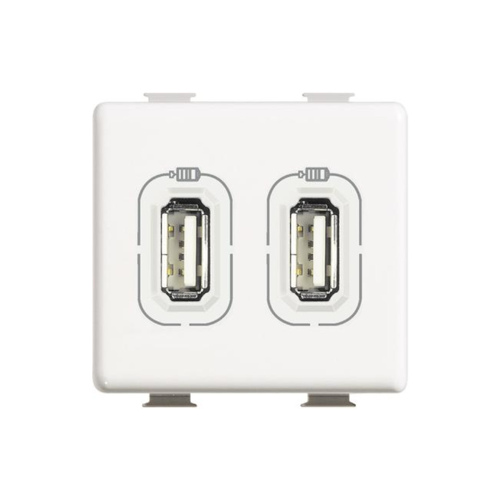 Presa USB doppia bianca 5Vd.c. di Bticino Matix. Utile per collegarci cavi Usb di alcuni dispositivi elettronici fino 2400mA come smartphone, tablet e similari. Ricarica contemporanea di due dispositivi fino a 1200mA. Alimentazione 230V.