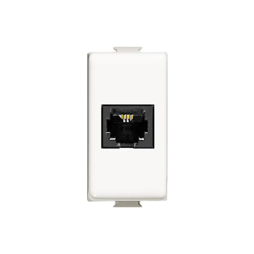 Presa RJ11 di Bticino Matix bianco. Utilizzata per il collegamento di apparecchi telefonici fissi e cordless tramite plug. Connessione a morsetto.