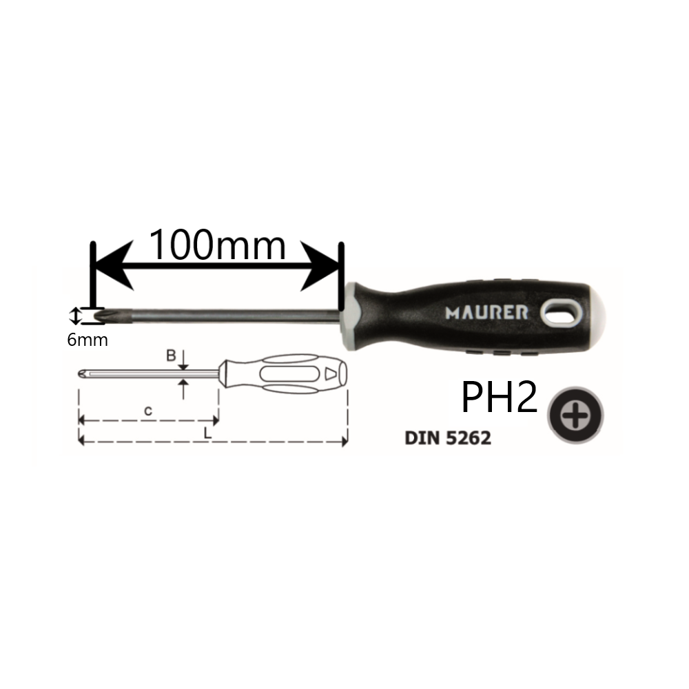 Cacciavite a croce Phillips PH2x100 mm Maurer Plus in acciaio S2. Punta sottoposta ad un trattamento termico al manganese. Lama in acciaio cromo al molibdeno, materiale che conferisce elevata durezza. Impugnatura ergonomica in materiale bicomponente TPR+PP. Rispetta le norme DIN 5262. Maurer ti propone un’offerta completa di prodotti per ogni tipo di lavorazione e riparazione. Per i lavori più impegnativi Maurer offre una linea di prodotti selezionata, dalla qualità superiore, capace di garantirti risultati sempre soddisfacenti. È Maurer Plus, il “fai da te” a livello professionale che risponde alle richieste degli artigiani e degli hobbisti più esigenti!