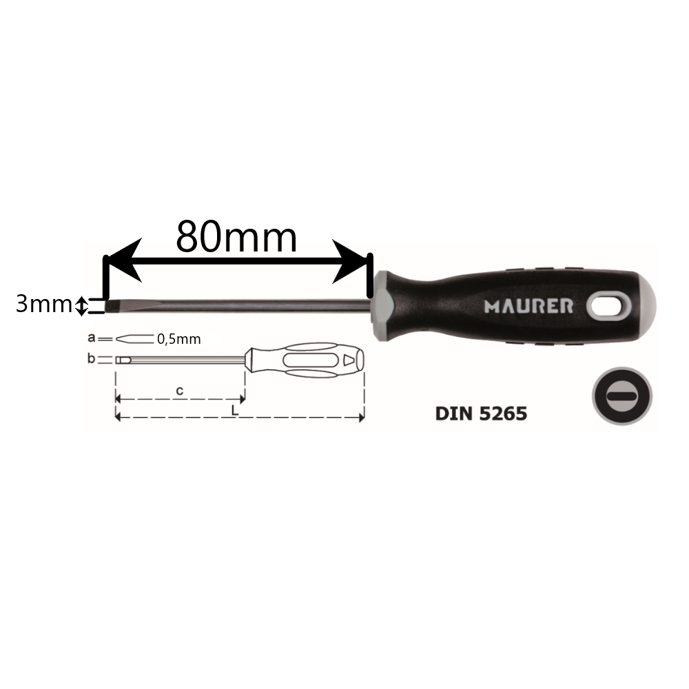 Cacciavite a taglio per elettricisti 0,5x3x80 mm Maurer Plus in acciaio S2. Punta sottoposta ad un trattamento termico al manganese. Lama in acciaio cromo al molibdeno, materiale che conferisce elevata durezza. Impugnatura ergonomica in materiale bicomponente TPR+PP. Rispetta le norme DIN 5265. Maurer ti propone un’offerta completa di prodotti per ogni tipo di lavorazione e riparazione. Per i lavori più impegnativi Maurer offre una linea di prodotti selezionata, dalla qualità superiore, capace di garantirti risultati sempre soddisfacenti. È Maurer Plus, il “fai da te” a livello professionale che risponde alle richieste degli artigiani e degli hobbisti più esigenti!