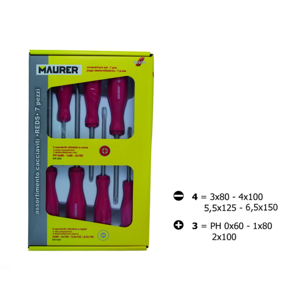 Assortimento di cacciaviti in acciaio al cromo vanadio Maurer. Il Vanadio conferisce agli acciai un’estrema durezza, anche a elevate temperature. L’acciaio al Cromo Vanadio dunque è estremamente resistente. Utilizzare dei cacciaviti in questo materiale significa avere un’usura minore dei cacciaviti stessi e una maggiore durata. Dotati di impugnatura rossa di forma cilindrica per favorire la presa. 7 pezzi: 4 a taglio e 3 a croce (PH0x60mm-PH1x80mm-PH2x100mm-TG3x80mm-TG4x100mm-TG5x125mm-TG6x150mm). Confezionati in scatola appendibile. Maurer ti propone un’offerta completa di prodotti per ogni tipo di lavorazione e riparazione: dall’utensile manuale agli strumenti di misura, dal materiale elettrico e idraulico a quello per la pittura, fino ad arrivare al fissaggio e ai sigillanti. Sono oltre 6.000 i prodotti Maurer tra cui scegliere per trovare sempre quello che stai cercando.