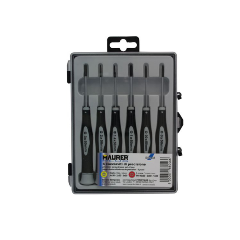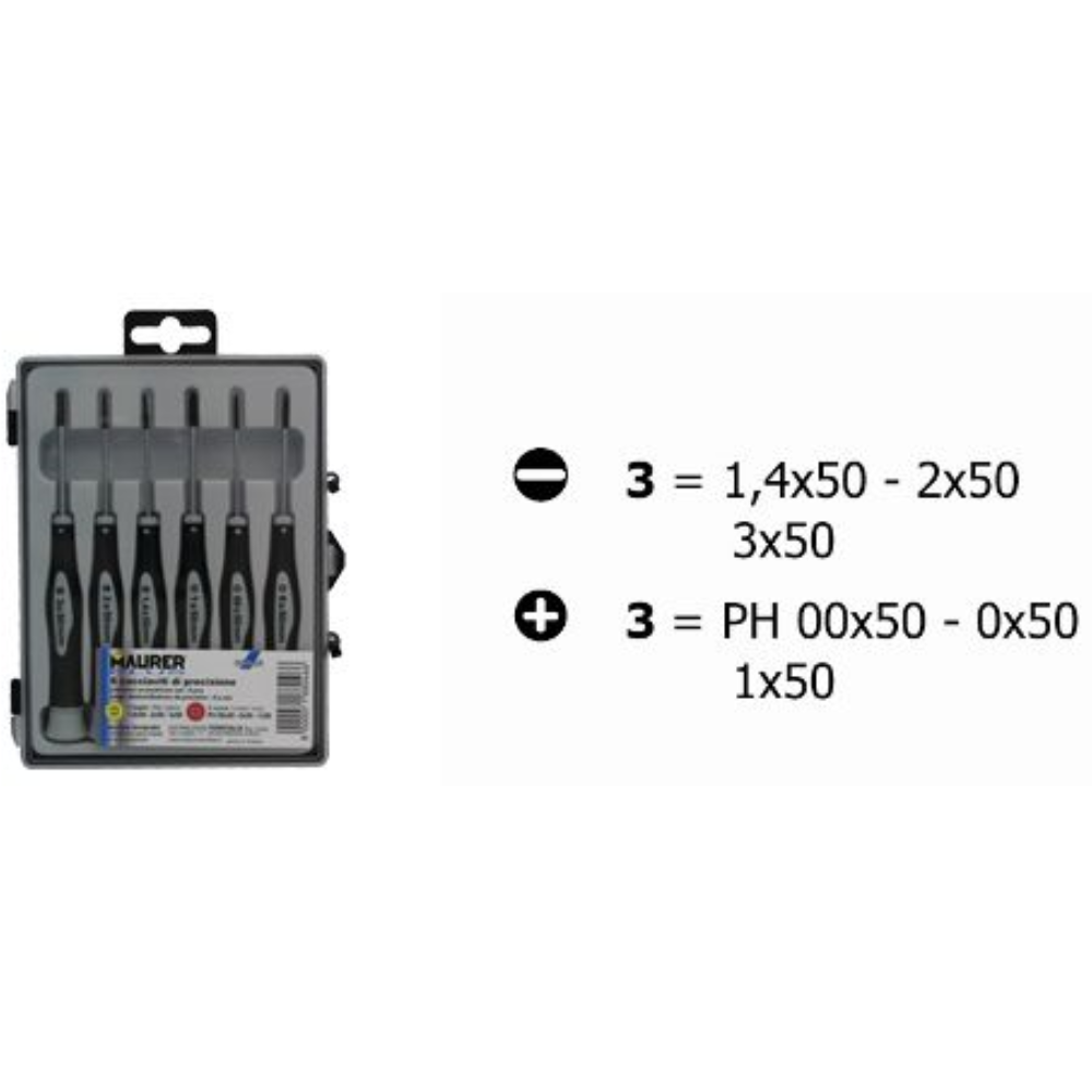Cacciaviti da orologiaio professionali in acciaio temperato Maurer Plus. La struttura ricca di carbonio dell’acciaio temperato causa l’aumento di durezza e di resistenza a trazione dell’acciaio. Ideali per lavori di precisione fai-da-te. Assortimento da 6 pezzi: 3 a taglio e 3 a croce (PH00x50mm-PH0x50mm-PH1x50mm-TG1,4x50mm-TG2x50mm-TG3x50mm). Maurer ti propone un’offerta completa di prodotti per ogni tipo di lavorazione e riparazione: dall’utensile manuale agli strumenti di misura, dal materiale elettrico e idraulico a quello per la pittura, fino ad arrivare al fissaggio e ai sigillanti. Sono oltre 6.000 i prodotti Maurer tra cui scegliere per trovare sempre quello che stai cercando. Per i lavori più impegnativi Maurer offre una linea di prodotti selezionata, dalla qualità superiore, capace di garantirti risultati sempre soddisfacenti. È Maurer Plus, il “fai da te” a livello professionale che risponde alle richieste degli artigiani e degli hobbisti più esigenti!