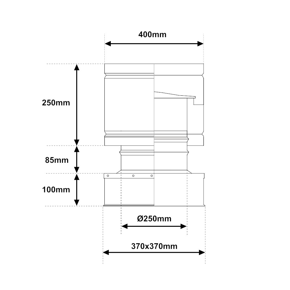 Cappello antivento con base quadra in acciaio INOX mono parete Ø 250mm, adatto per evitare l’entrata di acque meteoriche all’interno della canna fumaria. Il raccordo terminale è la scelta ideale per la costruzione di impianti di scarico di fumi derivanti da combustione di gas metano, gasolio o legna. Il cappello antivento ha un diametro di 250mm ed una base quadrata da 370mm x 370mm. In aggiunta è realizzato in acciaio inossidabile a parete singola. L’acciaio è un materiale eccellente per la realizzazione di circuiti di scarico di fumi. Difatti questo materiale è in grado di garantire un’elevata resistenza ed un’alta durabilità nel tempo. La scelta di utilizzare canne fumarie e raccordi in acciaio inox consente di ottimizzare la combustione e ridurre notevolmente sia i consumi che le sostanze inquinanti. Il cappello in acciaio è perciò la scelta ideale per il vostro impianto di smaltimento fumi. Il terminale a botte è disponibile in vari diametri.