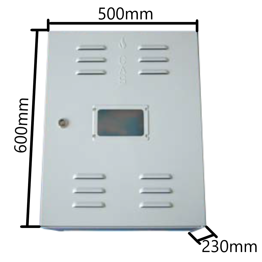 Box per contatore gas. Misure 600 x 500 x 230 mm. Realizzato in lamiera elettrozincata e verniciata con polveri epossidiche. Dotata di serratura con chiave in acciaio.