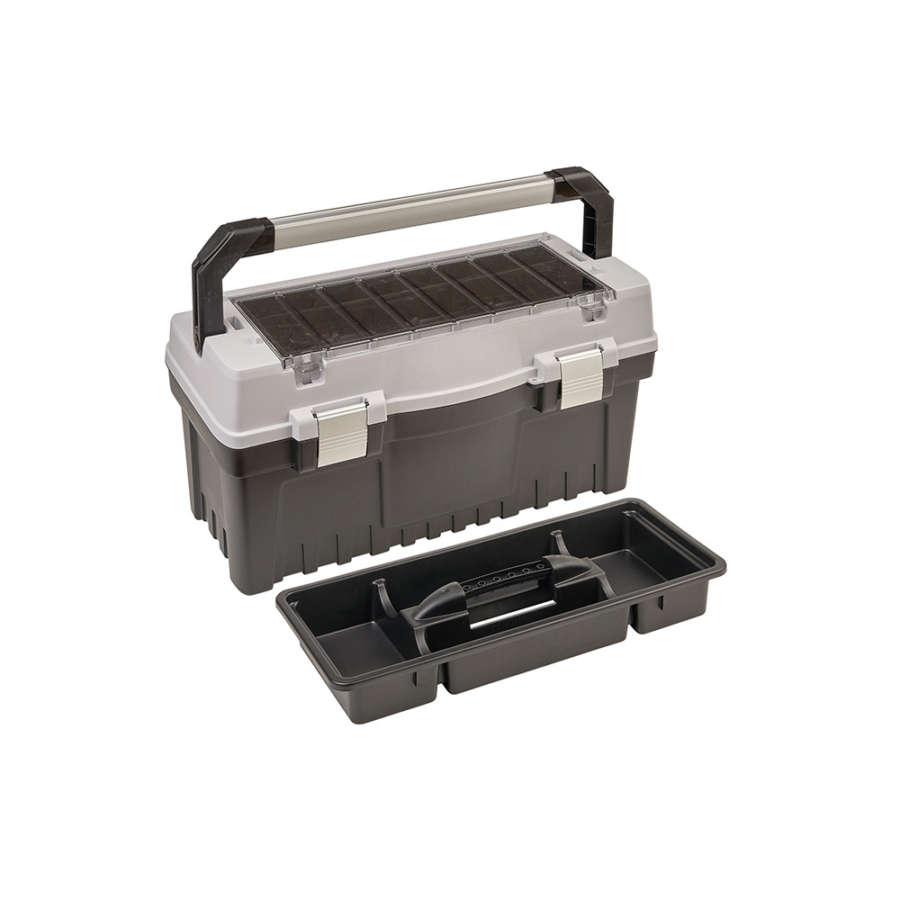 All’interno del coperchio è presente un ampio organizer con separatori regolabili, che consentono di adattare gli scomparti alle proprie esigenze, mentre la vaschetta estraibile permette di tenere separati gli attrezzi più piccoli da quelli più grandi. Le cerniere di chiusura in alluminio assicurano che tutto rimanga ben sigillato e al sicuro durante il trasporto.