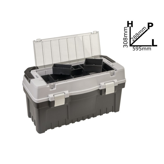All’interno del coperchio è presente un ampio organizer con separatori regolabili, che consentono di adattare gli scomparti alle proprie esigenze, mentre la vaschetta estraibile permette di tenere separati gli attrezzi più piccoli da quelli più grandi. Le cerniere di chiusura in alluminio assicurano che tutto rimanga ben sigillato e al sicuro durante il trasporto.