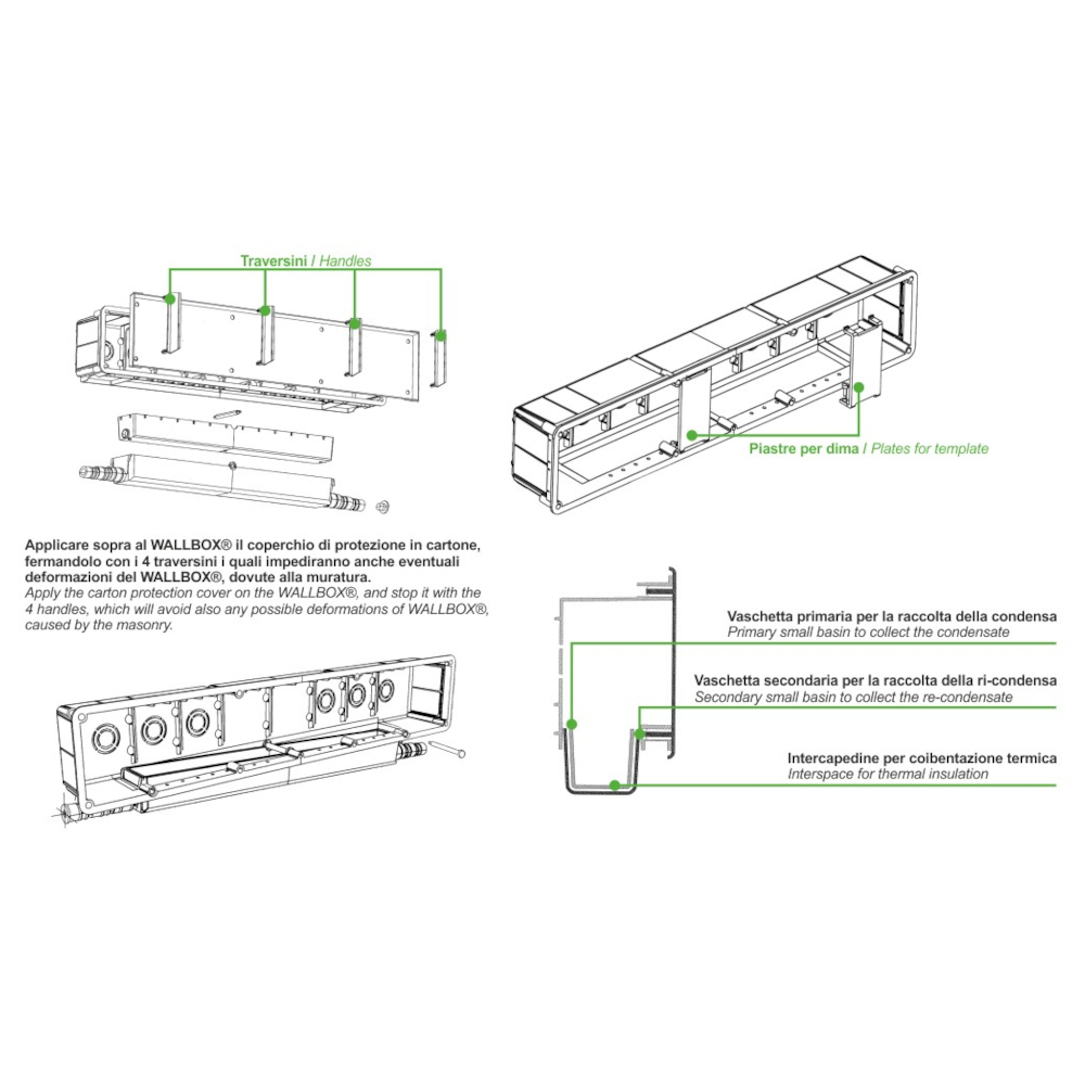 WALLBOX di Bonomini è una cassetta di predisposizione split per lo scarico condensa dei condizionatori con doppia uscita reversibile e regolabile. La cassetta è dotata di un coperchio di protezione in cartone e può essere fermato da quattro traversini. Questo è utile ad impedire deformazioni dovute alla muratura oltre ad evitare accumulo di detriti e polvere di cantiere. Ancora migliore è la presenza di due piastre per dima che facilitano il montaggio dell’ unità interna del climatizzatore, rendendo tutto più veloce e preciso. La scatola di predisposizione split per condensa condizionatori Bonomini ha il vantaggio della reversibilità destra e sinistra semplicemente con la regolazione della pendenza. Infatti, grazie alla doppia uscita di scarico regolabile, la cassetta è pronta per ogni esigenza di installazione ad incasso nel muro. Inoltre WALLBOX di Bonomini ha una doppia vaschetta per la raccolta della condensa oltre ad una coibentazione termica. Quest’ ultima evita i ponti termici e quindi l’ eventuale formazione di macchie di umido sulla parete dove è posizionato l’ impianto di condizionamento. I colori di Wallbox sono bianco e verde. Le misure della cassetta di predisposizione Bonomini per incasso nel muro dei condizionatori sono di H 98mm di altezza del frontalino visibile e P 60mm di profondità, la larghezza invece è di  L 420mm per la cassetta e L 510mm per i tubi di scarico.