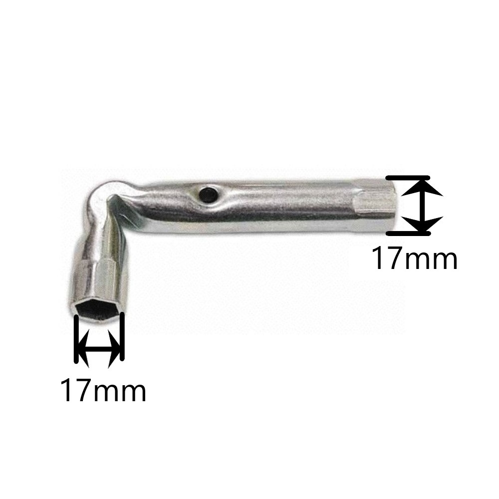 Chiave a pipa doppia. Realizzata in acciaio stampato. Tipo leggero. La chiave presenta due estremità esagonali con diametro 17 mm. Ideale per avvitare e svitare dadi e bulloni a testa esagonale.