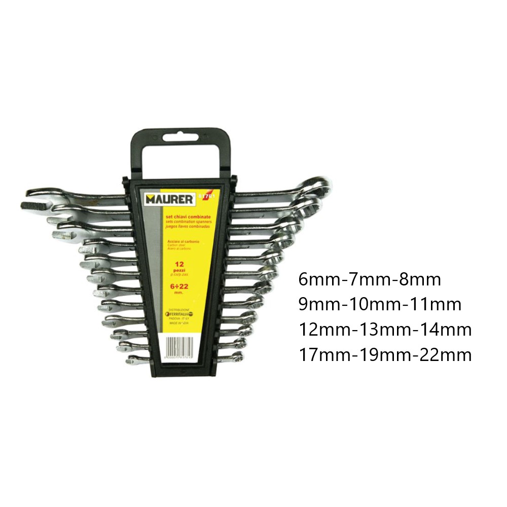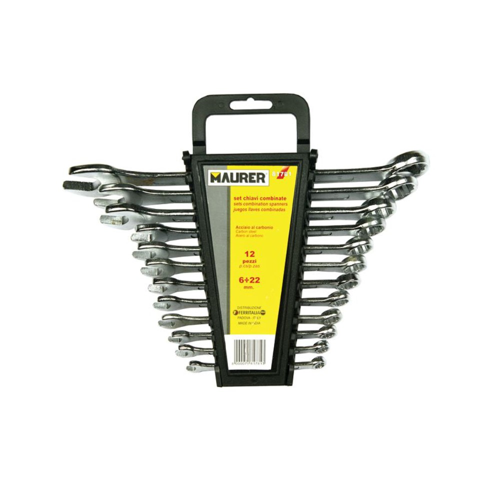 Chiavi combinate in acciaio al carbonio Maurer. 12 pezzi (6mm-7mm-8mm-9mm-10mm-11mm-12mm-13mm-14mm-17mm-19mm-22mm). Le chiavi presentano un’estremità aperta e una poligonale. Ideali per il fai-da-te per avvitare e svitare bulloni e dadi con testa esagonale. Maurer ti propone un’offerta completa di prodotti per ogni tipo di lavorazione e riparazione: dall’utensile manuale agli strumenti di misura, dal materiale elettrico e idraulico a quello per la pittura, fino ad arrivare al fissaggio e ai sigillanti. Sono oltre 6.000 i prodotti Maurer tra cui scegliere per trovare sempre quello che stai cercando.
