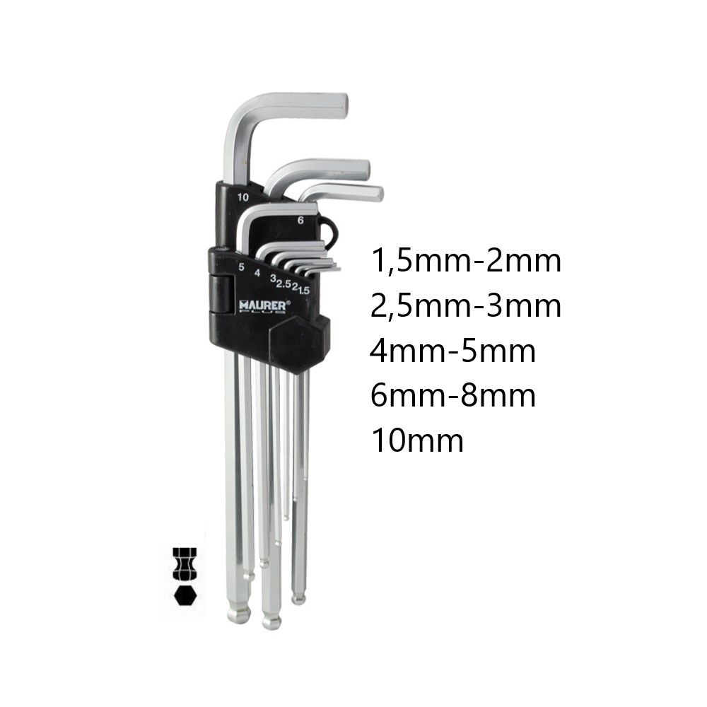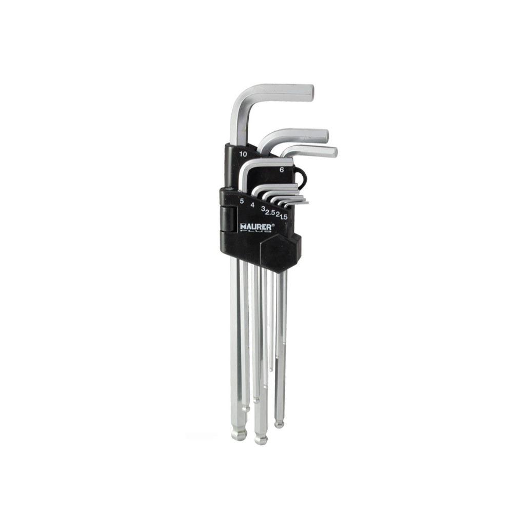 Chiavi esagonali lunghe maschio 9 pz. Maurer Plus (1,5mm-2mm-2,5mm-3mm-4mm-5mm-6mm-8mm-10mm). Dotate di testa sferica per avvitare e svitare bulloni con incavo esagonale con semplicità anche da angolazioni sfavorevoli. Realizzate in acciaio S2. Dotate di astuccio in PVC che permette di mantenere sempre le chiavi esagonali insieme e in ordine. Confezionate in blister. Maurer ti propone un’offerta completa di prodotti per ogni tipo di lavorazione e riparazione. Per i lavori più impegnativi Maurer offre una linea di prodotti selezionata, dalla qualità superiore, capace di garantirti risultati sempre soddisfacenti. È Maurer Plus, il “fai da te” a livello professionale che risponde alle richieste degli artigiani e degli hobbisti più esigenti!