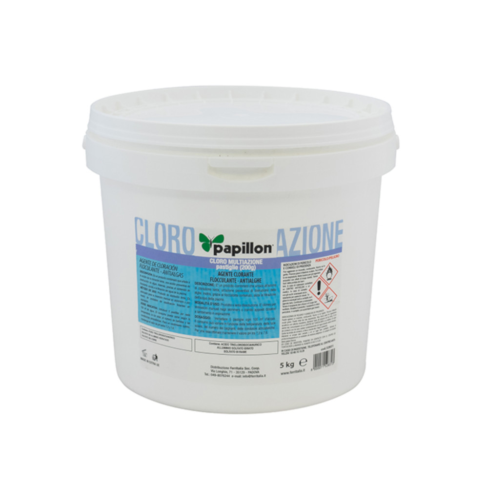 Il suo formato da 5kg garantisce una notevole durata nel tempo. Scegli anche tu il cloro in pastiglie multiazione Papillon, per una piscina sempre pronta all’uso.