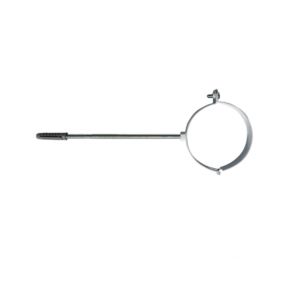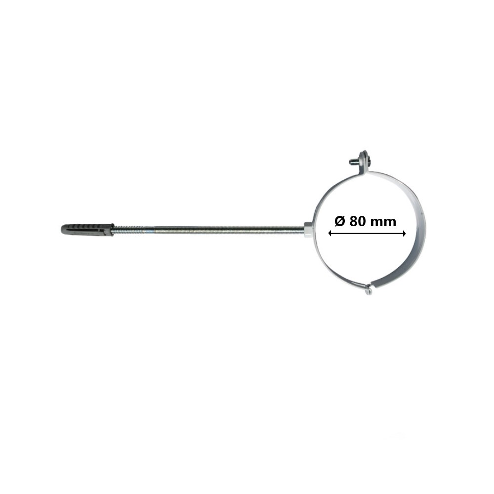 Collare verniciato bianco per tubi fumo di caldaie a condensazione e canne fumarie. Completo di vite doppia inox M8 x 200 e tassello SX. Ø 80 mm.