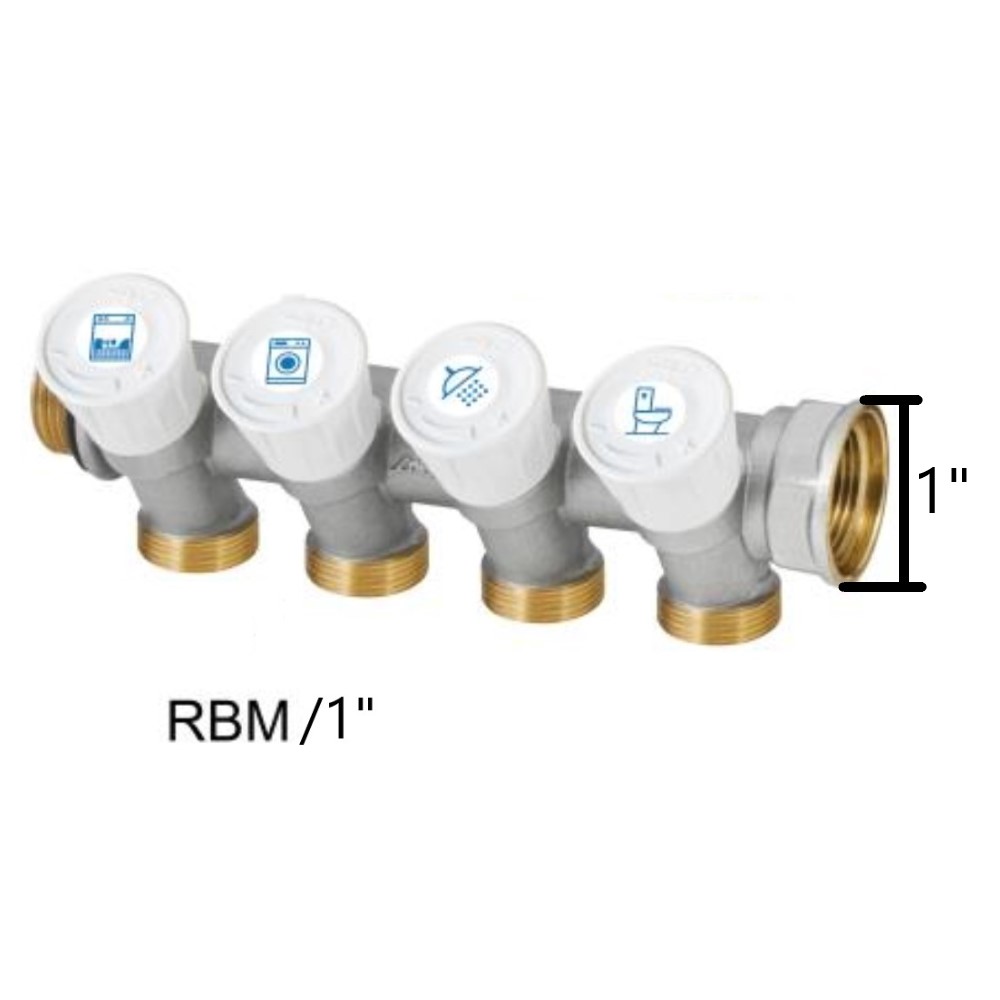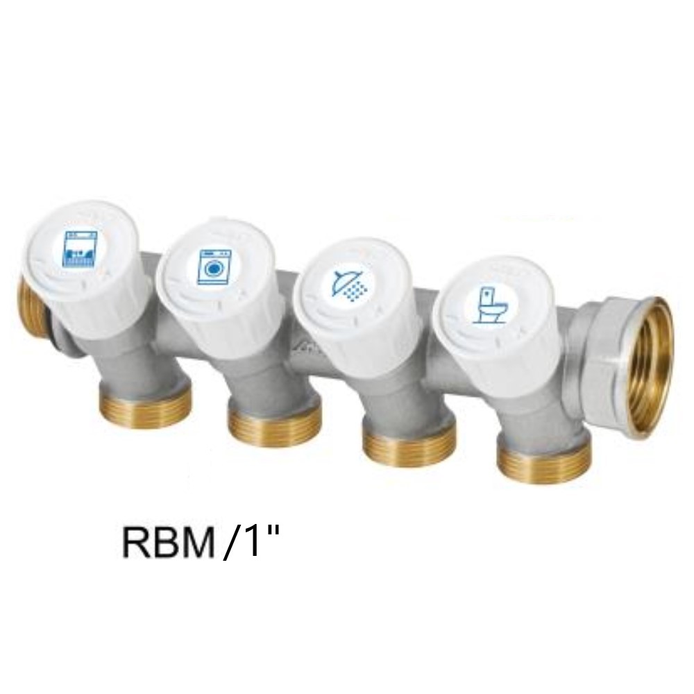 Collettore semplice componibile, con attacchi in linea, impiegabile per distribuzioni di circuiti sanitari. Derivazioni unilaterali complete di valvole di intercettazione micrometriche integrate. Modello 1″ 4 vie. Caratteristiche: