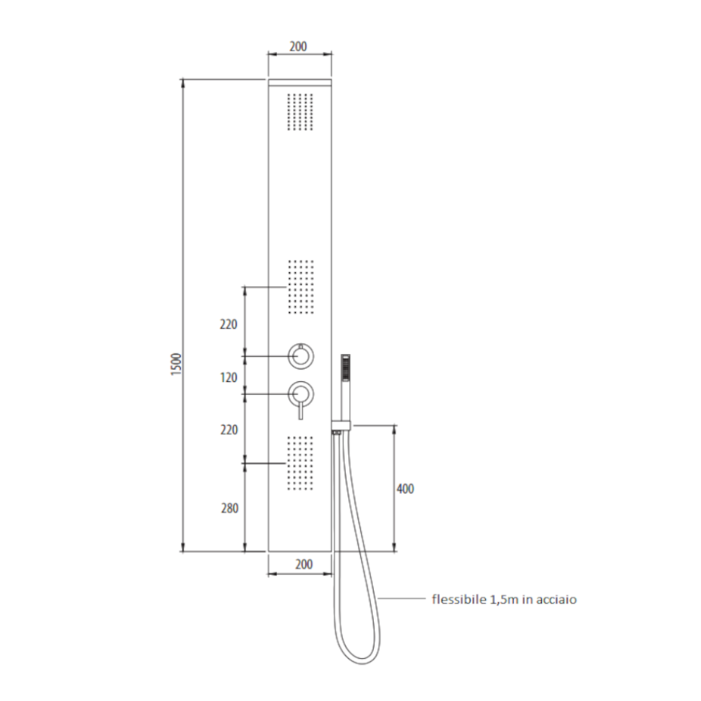 La colonna Queen di Idronord è realizzata in acciaio inossidabile 304 con spessore da 1mm. Questo materiale è particolarmente pregiato e resistente ad eventuali urti e alla corrosione, inoltre dona una finitura effetto specchio, la quale risulta esteticamente piacevole. Inoltre presenta comode dimensioni di 1500×200, per un agile utilizzo del dispositivo adatto a tutta la famiglia. La parte frontale presenta un deviatore con 3 funzioni ed un miscelatore entrambi in ottone cromato, tali da garantire una massima durata nel tempo resistenti all’usura giornaliera. Inoltre si potrà modulare il tipo di getto in base alle proprie esigenze. Le manopole sono progettate in zama, questo materiale è una lega di zinco resistente ed economica. La colonna doccia della serie Queen, in aggiunta è dotata di un flessibile in acciaio inox, da 150cm.