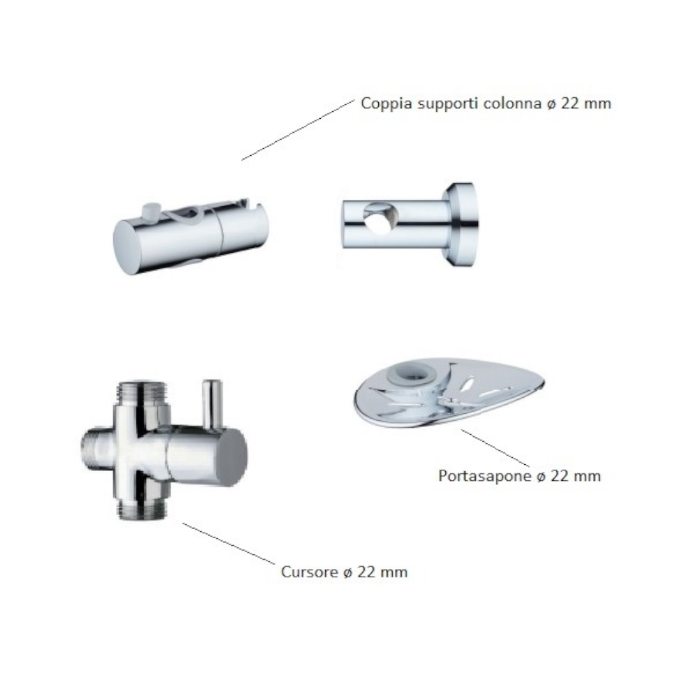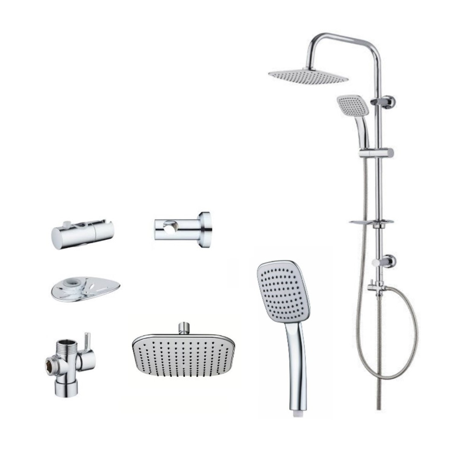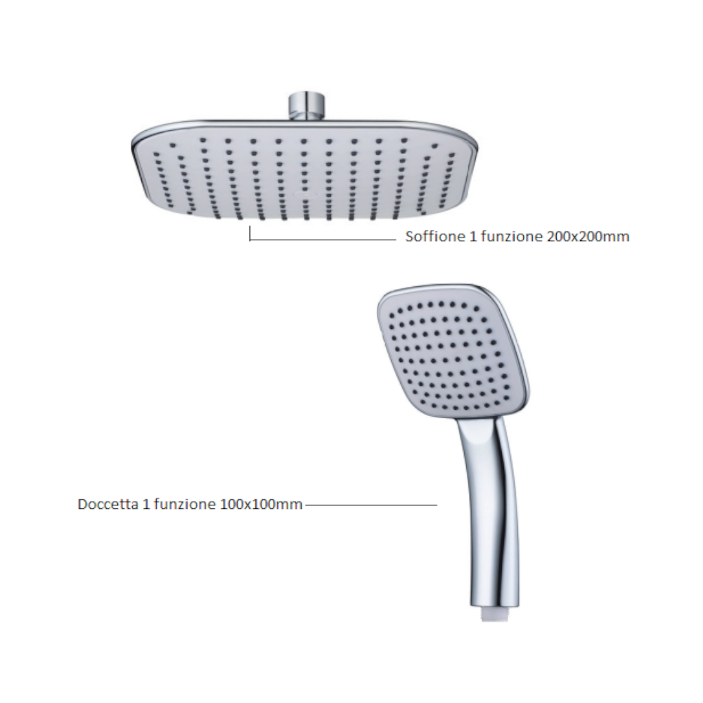 Il set doccia infatti, è composto da un’asta ø 22 x 100 mm in acciaio inossidabile. Questo materiale risulta resistente alla corrosione e all’usura quotidiana. Presenta un efficacie attacco 3/4”. Inoltre presenta un deviatore in ottone cromato, anche questo presenta una resistenza a lungo termine. Presenta inoltre un comodo flessibile in acciaio cromato da ben 150cm, per una massima flessibilità d’utilizzo. Per quanto riguarda gli altri accessori inclusi nel set, la colonna doccia è dotata di un portasapone, soffione 200×200 mm e doccetta 100×100 mm . Tutti questi elementi sono realizzati in ABS. Un plus di questo set doccia è la presenza di ugelli progettati per un’agevole fuoriuscita dell’acqua e per limitare la formazione di calcare, i quali sono presenti sul soffione e sulla doccetta.
