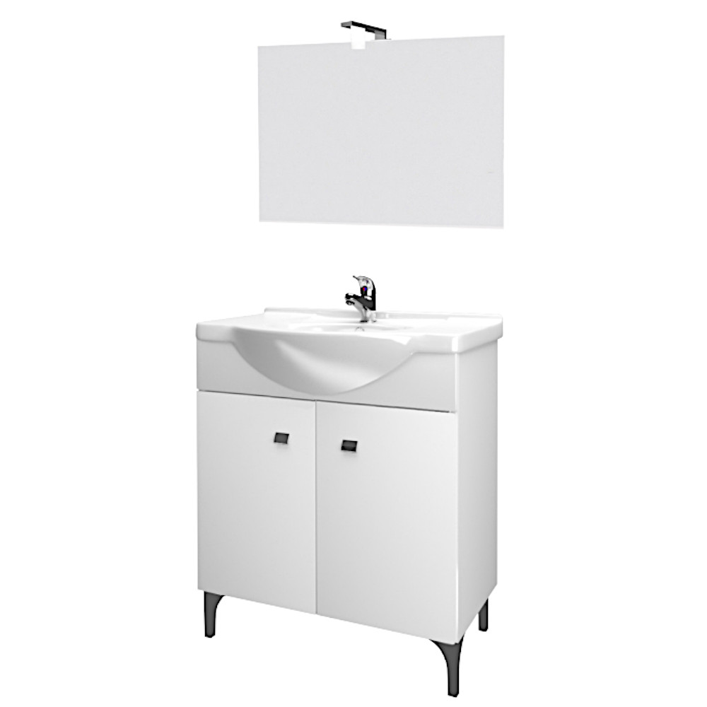 La composizione Klara è un mobile da bagno ed è cosi composta, un mobile base, un lavabo in ceramica, uno specchio con mensola e portalampada. Il mobile base ha due ante frontali apribili ed è in legno laccato di colore bianco con maniglie cromate, il lavabo che e posto sopra al mobile è in ceramica, e per completare e arricchito da uno specchio con una illuminazione alogena avente una mensola per riporre gli oggetti da bagno. Il Mobile Bagno della linea Klara ha uno stile elegante ed è una soluzione raffinata per arredare con gusto il tuo bagno, la cura del particolare ad un prezzo davvero accessibile.