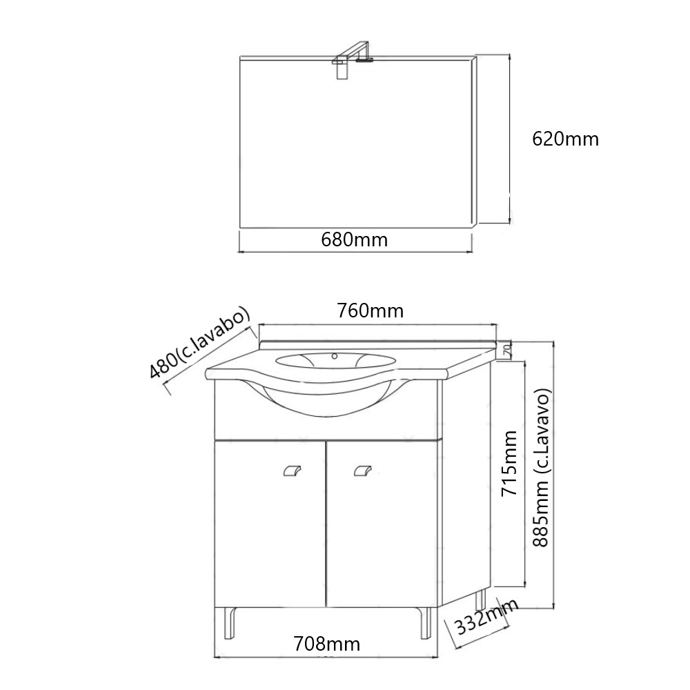 Misure singoli pezzi, il mobile base è di cm H 86 x L 75 x P 46, la specchiera cm H 75 x L 72 x P 12,5 (con mensola) mentre il lavabo consolle in ceramica Cm. 75