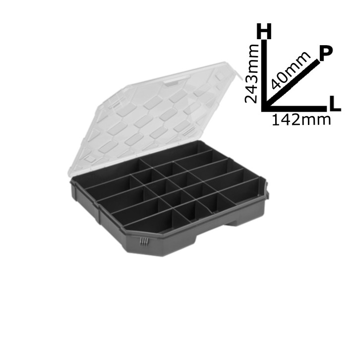 La cassetta portautensili si distingue per l’intelligente organizzazione interna, che ottimizza lo spazio disponibile. Al suo interno sono presenti divisori fissi che separano le diverse tipologie di minuteria, contribuendo a mantenere tutto in ordine e facilmente accessibile. Le sue dimensioni compatte facilitano il trasporto, rendendola perfetta sia per lavori professionali che per manutenzioni domestiche. Realizzata in materiale plastico resistente e robusto, garantisce durabilità nel tempo.