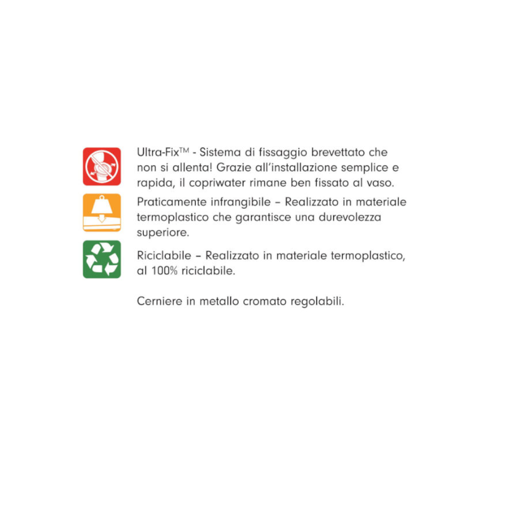Questo sedile per vaso è caratterizzato da un sistema di aggancio ULTRAFIX, ovvero fissaggio brevettato il quale impiega una notevole resistenza, in modo per non farlo allentare. Inoltre il montaggio sul vaso di scarico ULTRAFIX è un sistema di fissaggio con marchio registrato che rende la seduta sempre stabile. Presenta delle solide e regolabili cerniere in metallo cromato. In aggiunta è datato di perni di fissaggio a vite, i quali sono in acciaio inox. In questo modo si previene che il prodotto si ossidi se al contatto con sostanze corrosive. Presenta un’installazione semplice e rapida. Inoltre può essere effettuata dall’utente stesso, senza ricorrere all’intervento di un tecnico. Sono incluse delle istruzioni di fissaggio, chiare e coincise, per facilitare il processo d’installazione e per ottenere una resa efficiente e funzionale del prodotto.