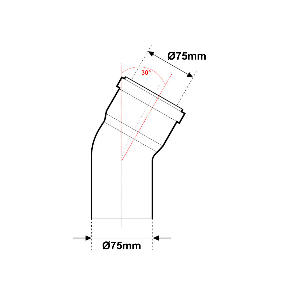 La curva a gomito Ultra Silent è un raccordo utilizzato nella realizzazione di impianti di scarico di acque reflue, impianti di irrigazione e di riscaldamento. Il raccordo ad angolo è utilizzato per collegare due tubature ed ottenere un’angolazione di 30°. La curva è idonea per essere installata, in ambienti in cui è richiesta conformità in materia di isolamento acustico. Può essere applicata in contesti residenziali, edifici commerciali e professionali. Inoltre il raccordo con sistema Ultra silent è utilizzato per la realizzazione di impianti di ventilazione e aspirazione polveri. Il sistema ultra silent, è compatibile alla connessione con materiali plastici in PP/PE-HD/PVC. La curva presenta un attacco maschio con diametro Ø75mm e un attacco femmina con diametro Ø75mm.