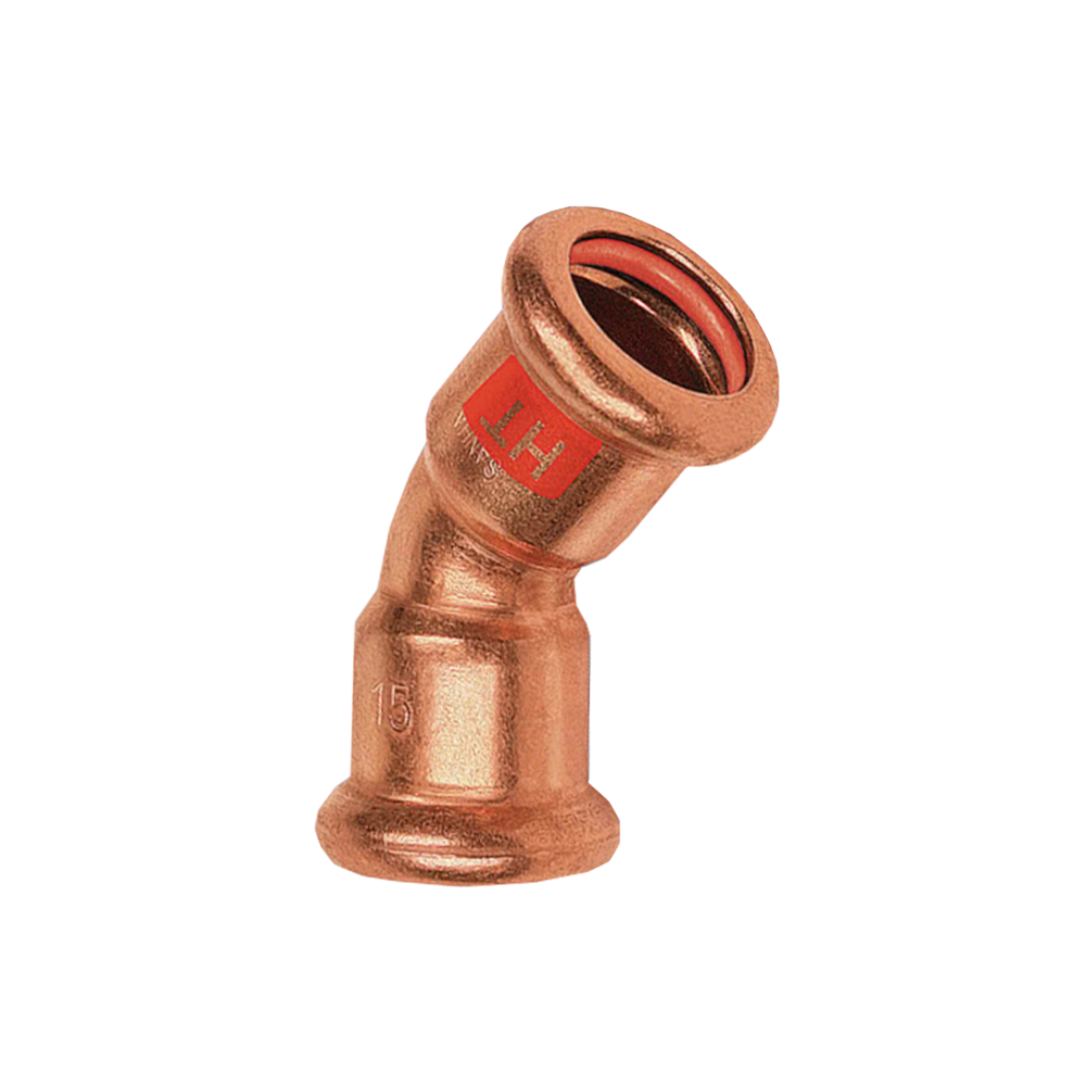 Il raccordo a pressare è utilizzato per raccordare tubazioni in rame e acciaio inox. Il raccordo ha una curva 45° ed è realizzato in rame. Ha diametro FF 35mm HT. La pressatura assicura collegamenti duraturi e di alta resistenza. In fase di collaudo, le giunzioni pressate, eviteranno il rischio di eventuali perdite, garantendo una maggiore sicurezza durante il lavoro di assemblaggio. Il sistema della Sanha garantisce la perdita in caso di mancata pressatura, questo plus lo rende unico nel suo genere.