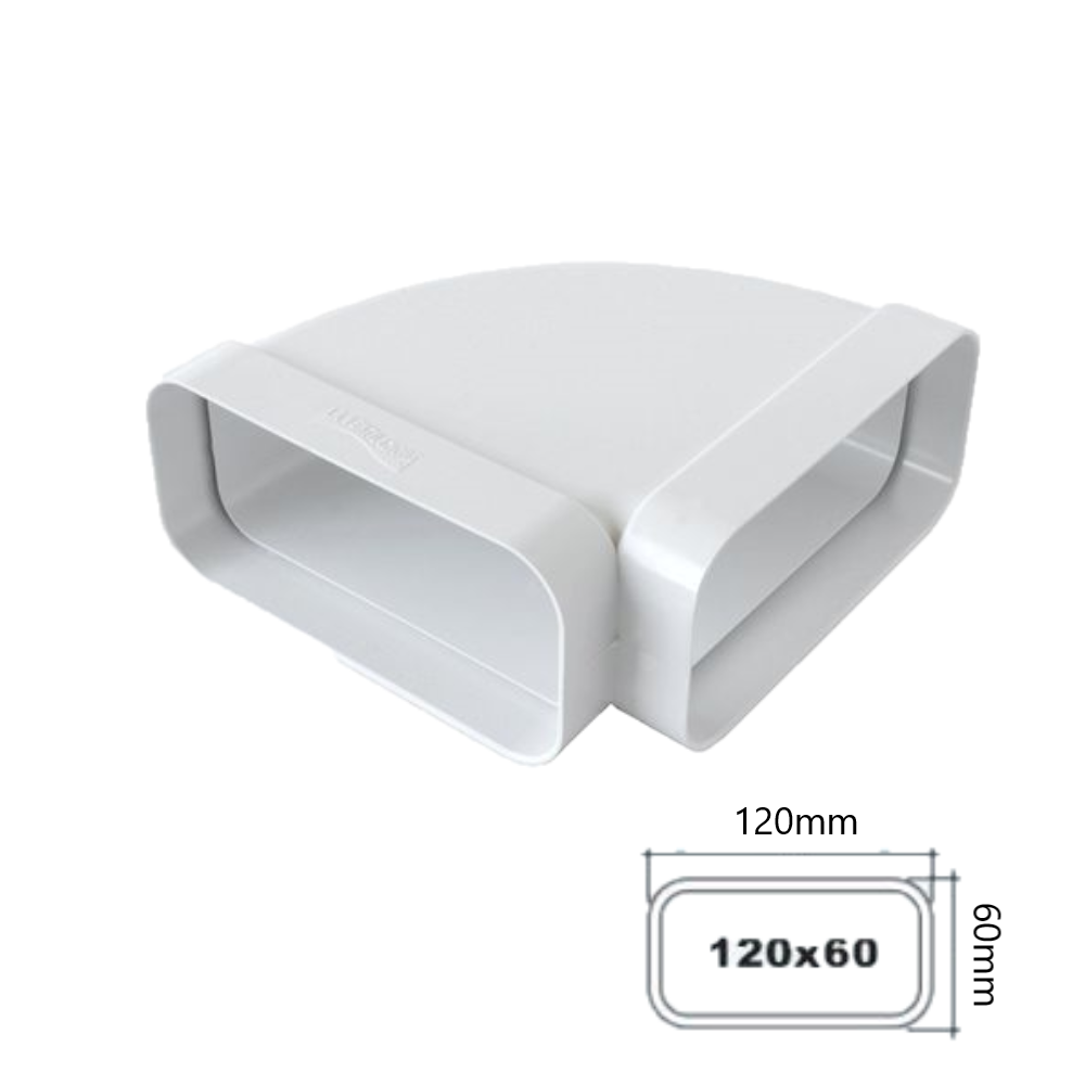 Curva orizzontale per tubo di areazione bianco rettangolare. Questa tubazione permette la corretta evacuazione di vapori e odori sgradevoli da ambienti, favorendo un corretto cambio d’aria. Da notare il suo principale utilizzo su cappa domestica o su sistemi di aspirazione aria in ambienti particolarmente umidi come i bagni.