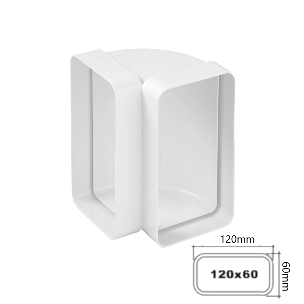 Curva verticale per tubo di areazione bianco rettangolare. Questa tubazione permette la corretta evacuazione di vapori e odori sgradevoli da ambienti, favorendo un corretto cambio d’aria. Da notare il suo principale utilizzo su cappa domestica o su sistemi di aspirazione aria in ambienti particolarmente umidi come i bagni.