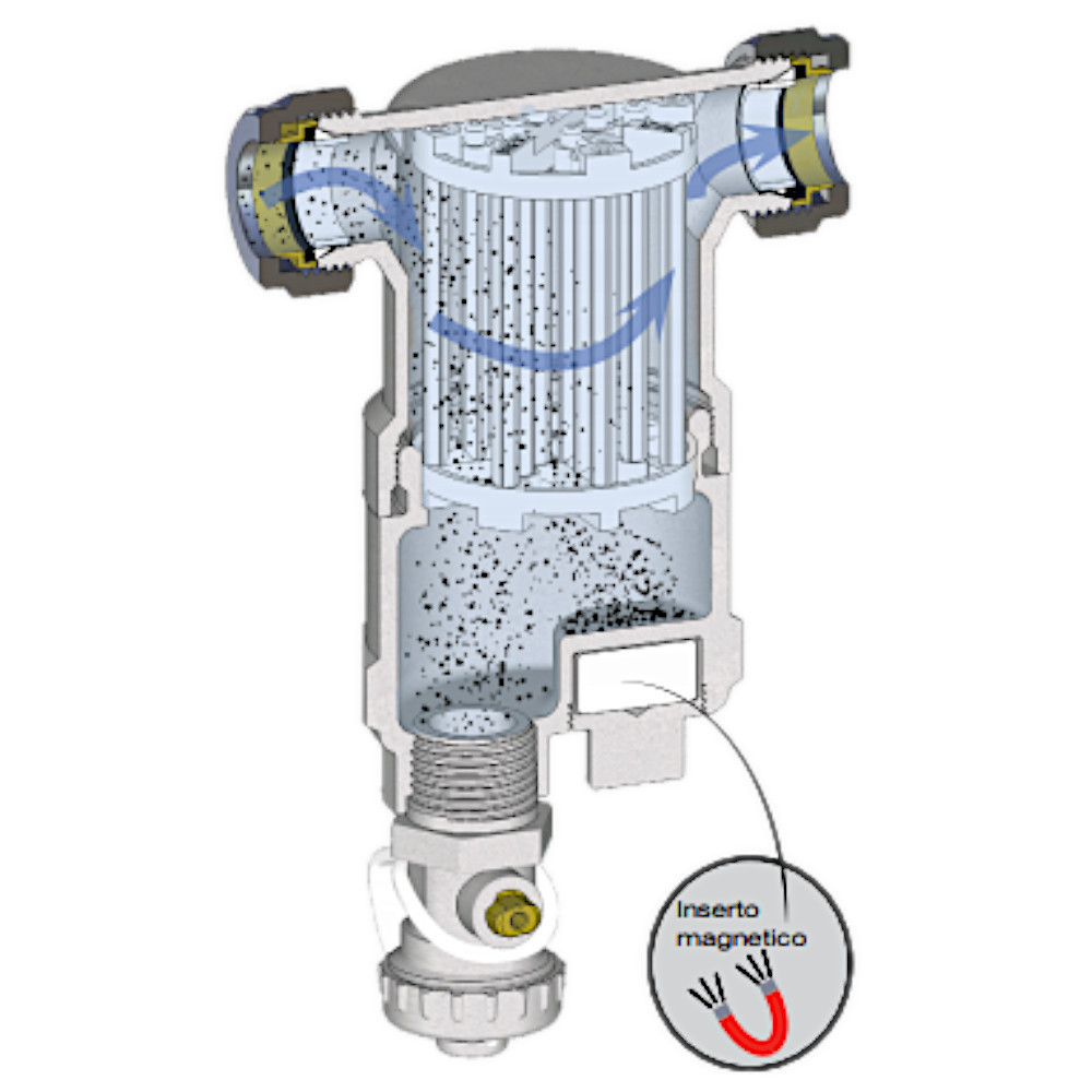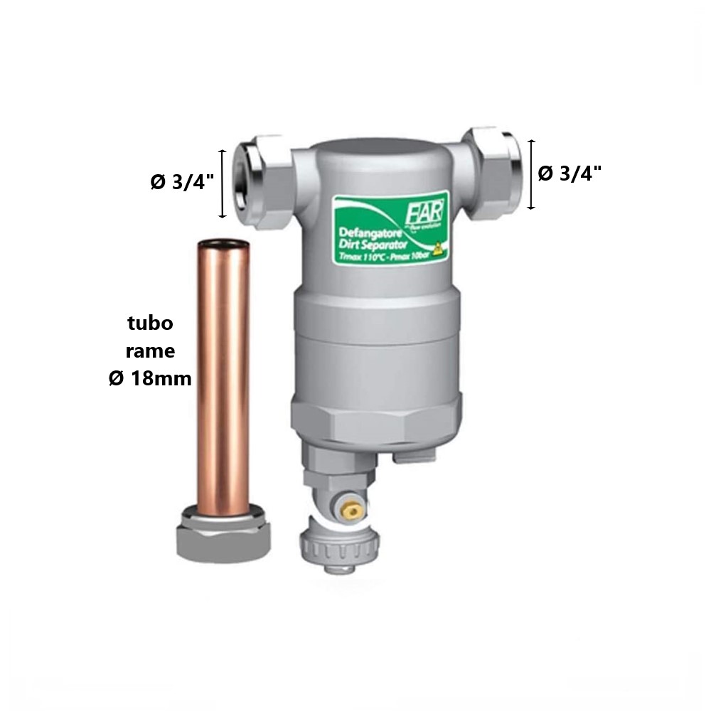 Il defangatore COMPACTFAR ultracompatto maschio con attacco Ø 3/4″ ,generalmente usato per impianti termici,è completo di magnete. Il filtro è un dispositivo appositamente studiato e progettato per essere installato su caldaie per uso domestiche. Il defangatore dispone suo interno di una cartuccia filtrante,la quale separa dall’acqua tutte le impurità presenti nelle tubazioni degli impianti di riscaldamento che potrebbero provocare alcuni danni, come le rotture o malfunzionamenti degli impianti. Il filtro ha nella sua parte inferiore un inserto magnetico,:la funzione è quella di separare l’acqua dalle impurità come incrostazioni e detriti dovuti alla corrosione, ciò permette al defangatore di essere particolarmente adatto per l’installazione su impianti in cui vi è una maggiore concentrazione di particelle ferrose. Le impurità come i sedimenti si depositano sul fondo, per poi essere eliminati tramite l’apertura di un rubinetto di scarico. Per un corretto funzionamento, deve essere sempre installato in posizione verticale.