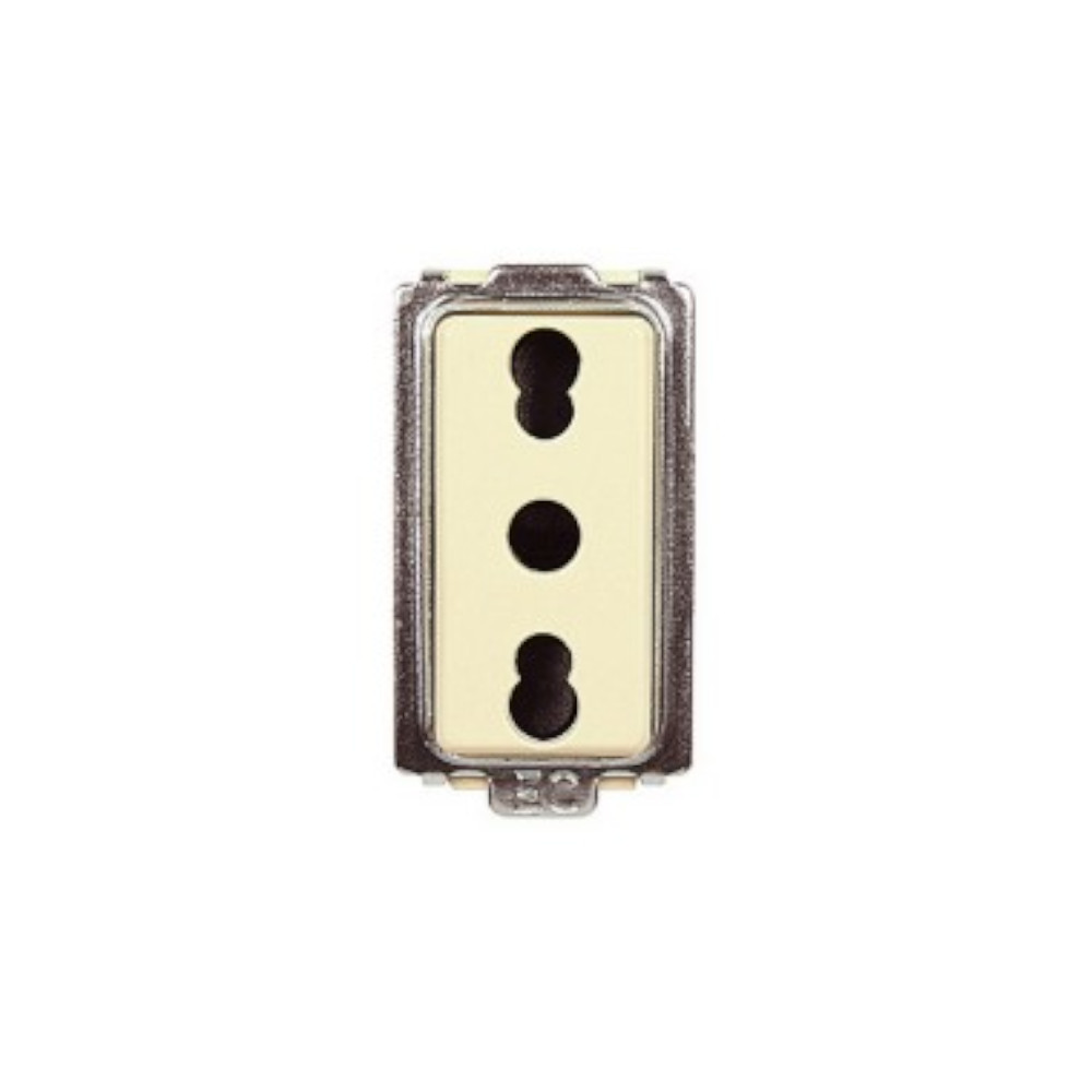 Presa bipasso 2P+T 10/16A 250V compatibile con Bticino Magic. La presa ha la possibilità di inserire sia spine piccole da 10A e sia spine grandi da 16A. Alveoli protetti.
