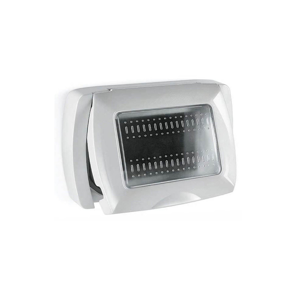 Placca 3 moduli autoportante compatibile con la serie Bticino Living. Il telaio è IP55 stagno con sportello, protegge i frutti da polvere e getti d’acqua.