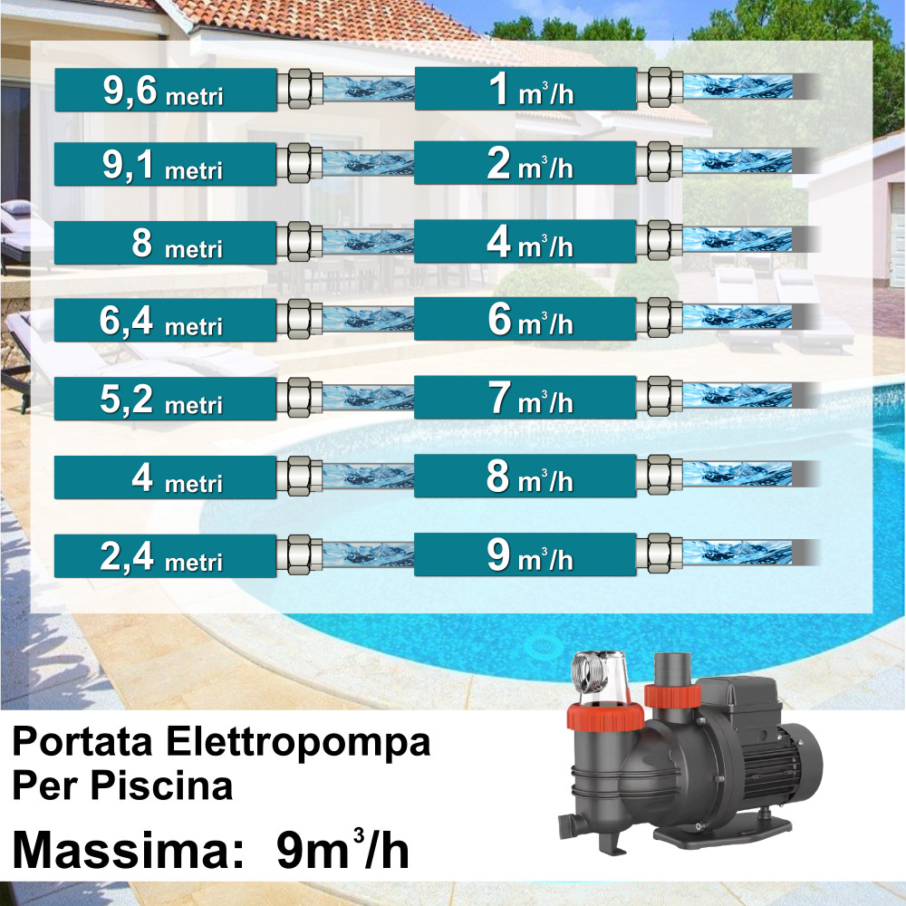 La potenza in cavalli della pompa è di 0,75hp e quindi garantisce un ricircolo dell’acqua alla velocità di 9 metri cubi all’ora, quindi ideale per piccole o medie piscine. L’alimentazione della pompa è di tipo Monofase e quindi lavora con voltaggio di 230-240V a 50Hz. Garantisce un alto rendimento con servizio continuo e l’acqua su cui andrà a lavorare l’elettropompa non dovrà superare i 35°C. I materiali della pompa per piscina sono tutti di prima scelta, partendo dal corpo pompa tecnopolimero e la girante in Noyl, famoso per la sua alta resistenza e qualità.