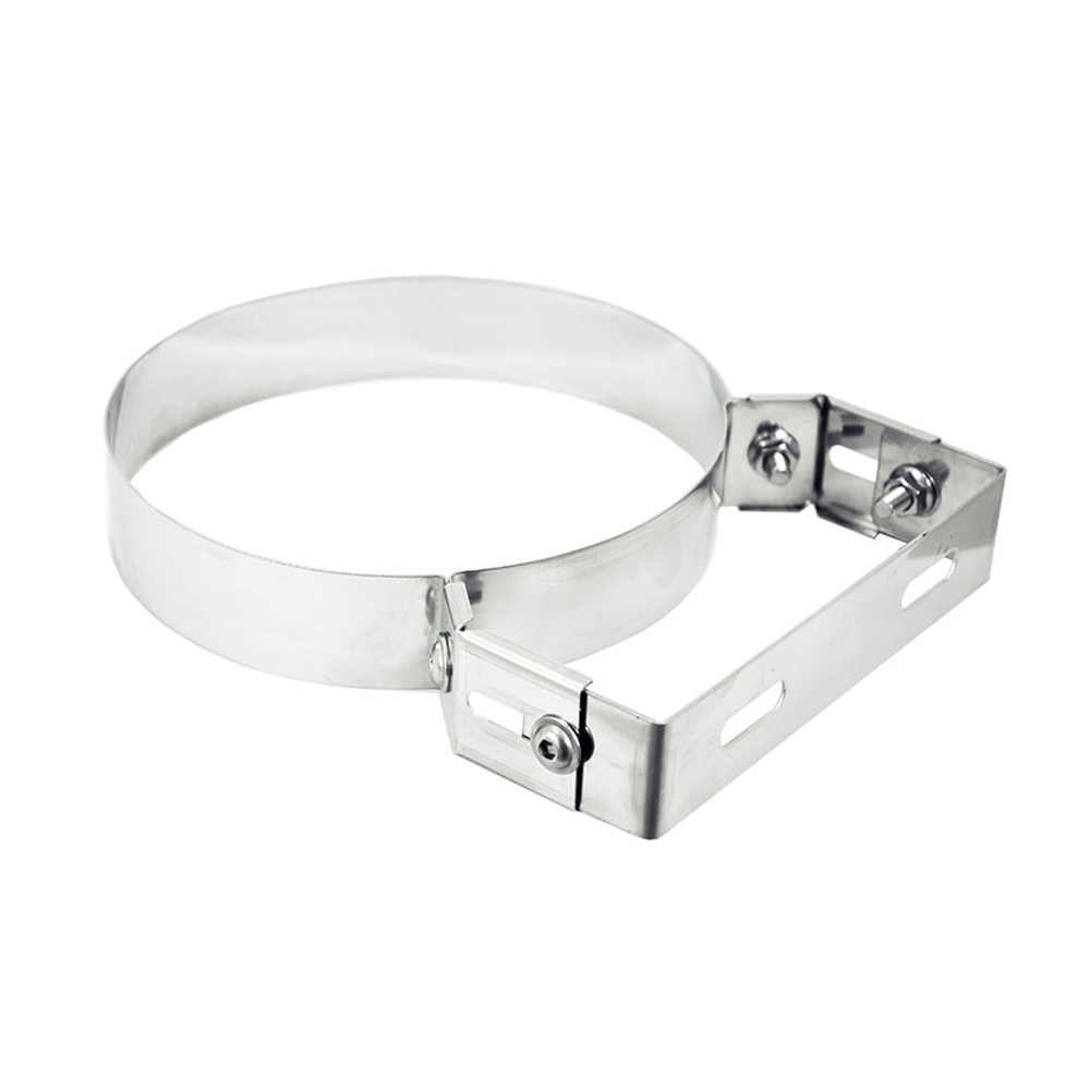 La fascetta murale regolabile INOX Ø 130mm, consente il fissaggio a muro di una conduttura. La fascetta murale è un elemento essenziale nella realizzazione di un sistema camino, difatti consente l’ancoraggio della conduttura al muro. Facendo ciò è possibile evitare che la conduttura si muova con le vibrazioni causate dalla stufa. La staffa di fissaggio è realizzata in acciaio inossidabile ed ha un diametro da 130mm, quindi compatibile con tubi dello stesso diametro. In aggiunta la fascetta è munita di una base regolabile da 50mm ad 80mm. Mentre il fissaggio a muro avviene tramite i fori presenti sulla staffa. La fascetta murale in acciaio inox è disponibile in varie misure. Bulloni e tasselli per il fissaggio a parete non inclusi con la staffa. può essere installato con facilità, quindi in maniera del tutto autonoma.