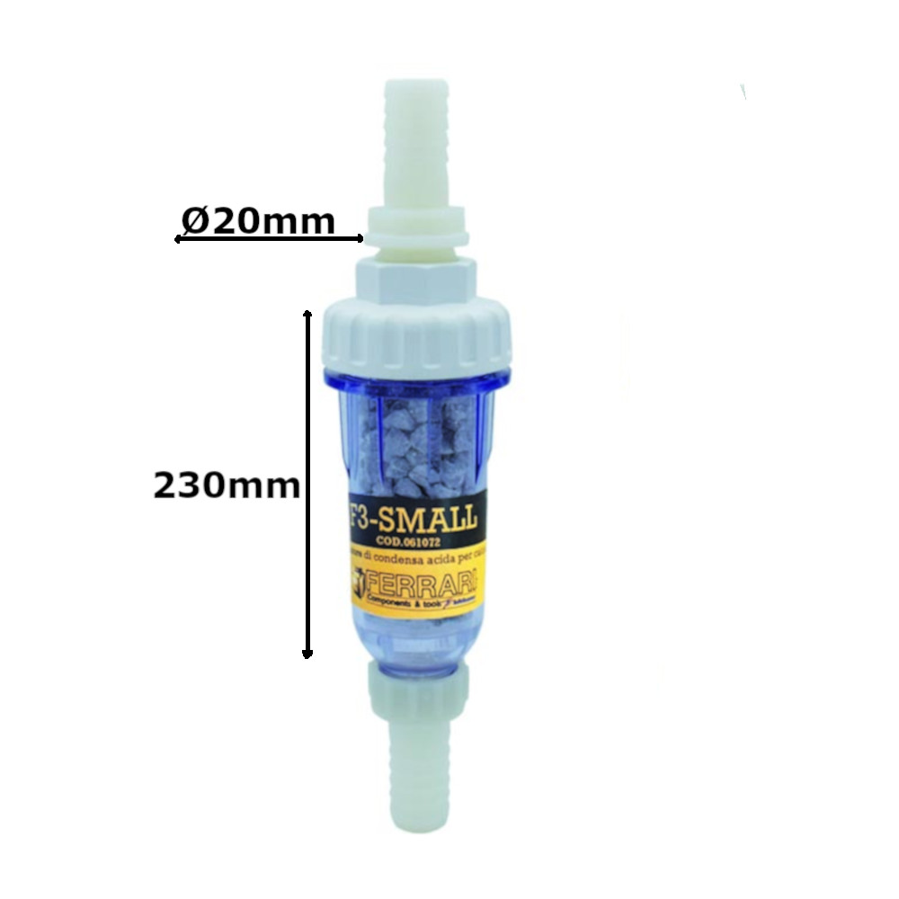 Il filtro si presenta con dimensioni compatte, è realizzato con un contenitore in plastica resistente al pH acido della condensa. Trasforma automaticamente l’acqua acida in acqua neutra grazie a uno speciale materiale filtrante contenuto al suo interno.
