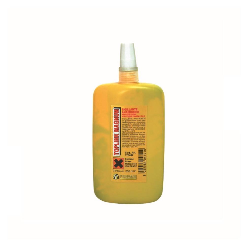 Sigillante anaerobico per la tenuta di giunzioni filettate (max 3″) e parti piane metalliche. Utilizzabile per acqua, gas, olii e carburanti. T.E. 50°/+150°. Flacone da 250 ml.