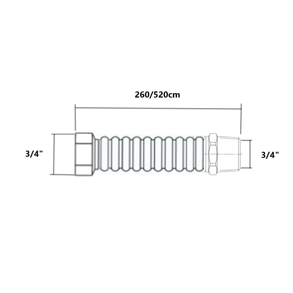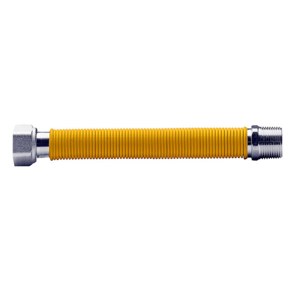 Il tubo flessibile in acciaio inossidabile maschio femmina, con rivestimento protettivo di colore giallo, provvisto di dado girevole con filettatura femmina ISO 228 G da 3/4″ e maschio conico con filettatura da 3/4″ EN 10226 R (ISO 7 R ), già pre-assemblati all’estremità, per il collegamento di apparecchiature di gas fisse o ad incasso. E’ un tubo metallico flessibile usato negli impianti per il trasporto di gas, dotato di un rivestimento di sicurezza (Leo Gas) con certificazione a norma UNI 11353. Il raccordo ha una estensione che varia da 2,60 metri fino ad un massimo di 5,20 metri. Il tubo è provvisto di un rivestimento di protezione, che ne garantisce una minore corrosione nel tempo.
