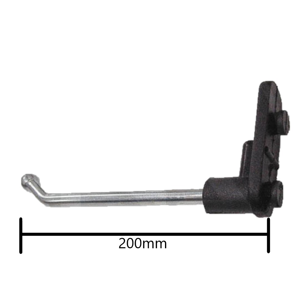 Gancio per pannelli portautensili. Lunghezza 200 mm. Corpo realizzato in acciaio zincato e nylon di colore nero. Utilizzo su pannelli portautensili.