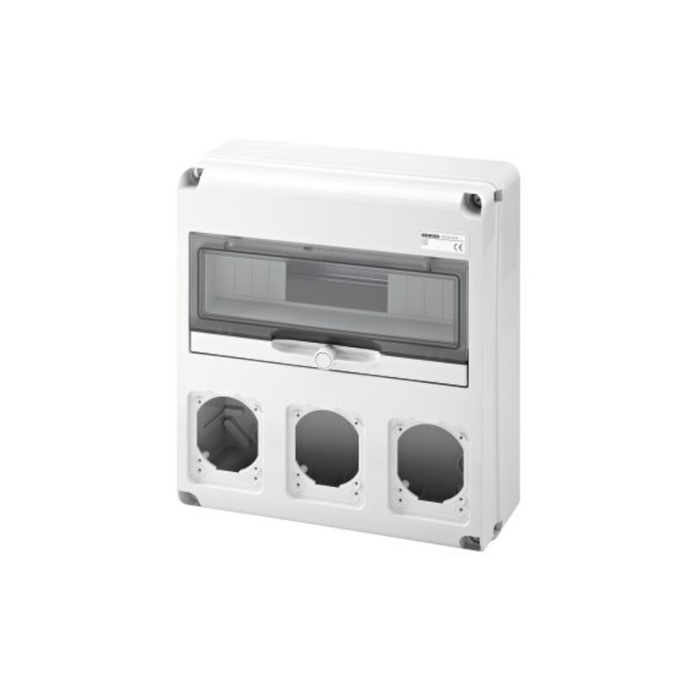 Quadro elettrico da parete 14 moduli predisposto per 3 prese fisse incasso o per 3 calotte stagne 16A, con interruttori ispezionabili per mezzo di una portella. Utilizzato nell’ambito terziario, industriale e cantiere. Si possono installare le calotte GW27401, GW62205H E GW62210H.