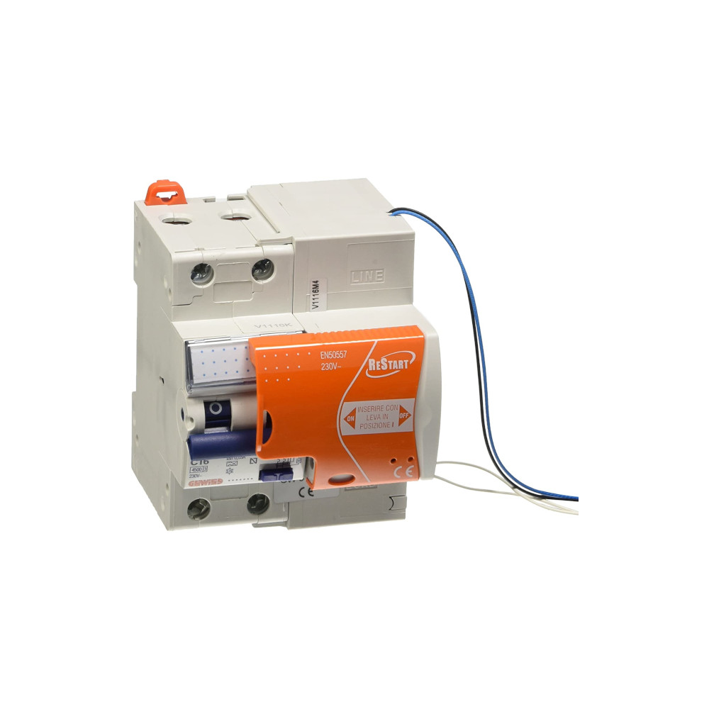 Gewiss Restart interruttore magnetotermico differenziale salvavita 2poli 16A Idn 0,03A curva C. Restart è un dispositivo che in automatico riarma un interruttore differenziale dopo aver controllato lo stato di isolamento dell’impianto.