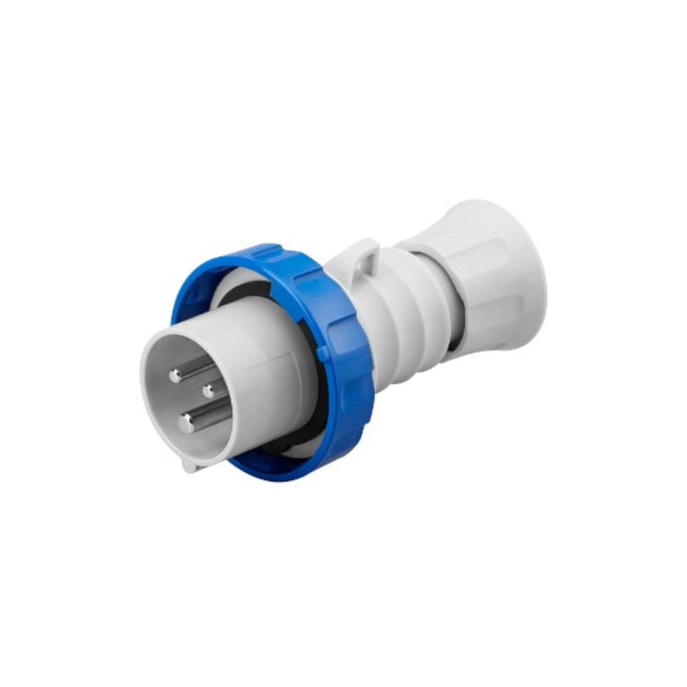 Spina mobile industriale diritta IP66/IP67 2P+T 16A 200-250V 6H blu. Utilizzata per il cablaggio di prolunghe, utensili e macchine industriali. Cablaggio a vite