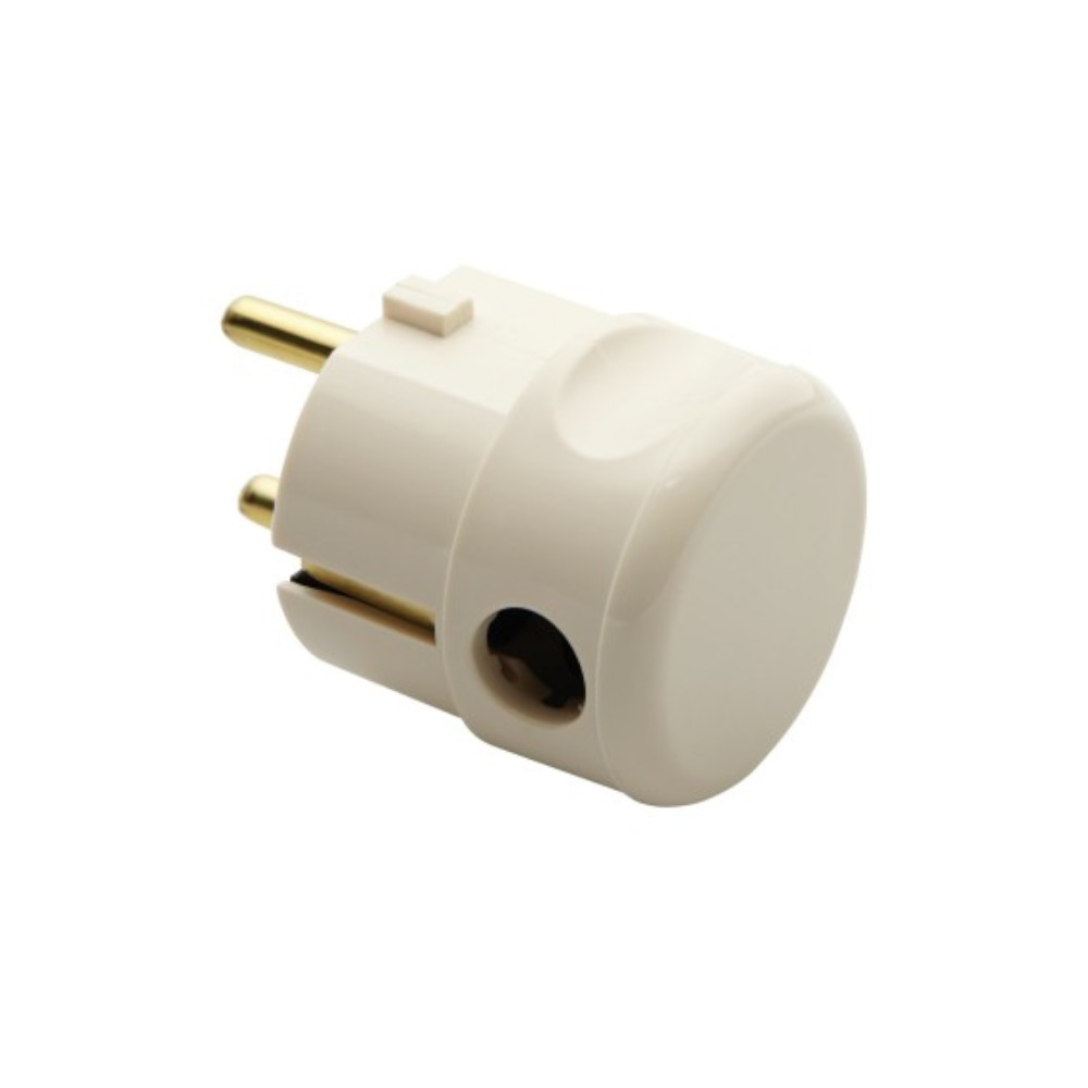 Spina mobile 90 gradi 2P+T 16A 250V bianca. Utilizzata per il cablaggio di prolunghe, utensili, caldaie a gas. Cablaggio a vite tipo schuko standard tedesco